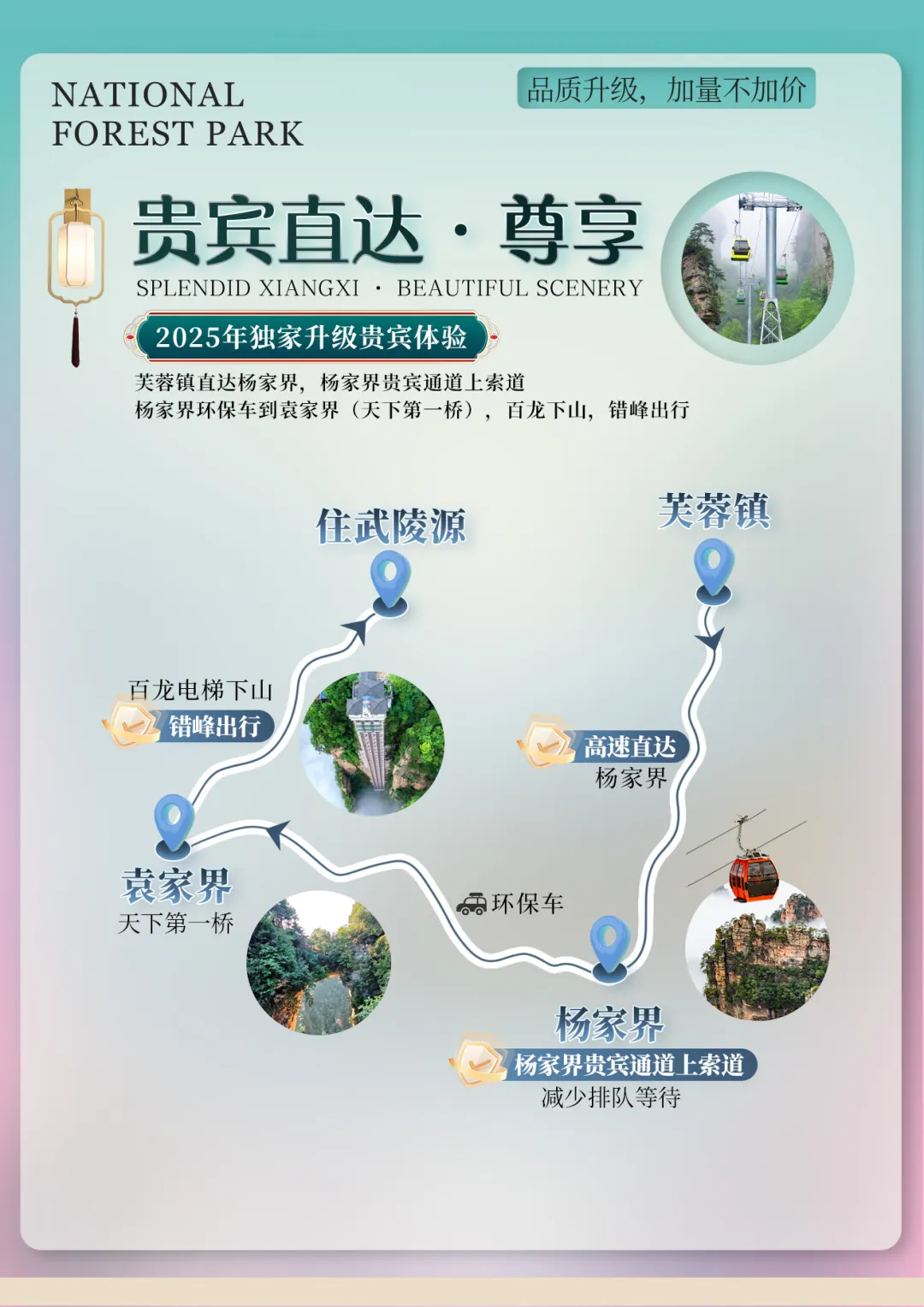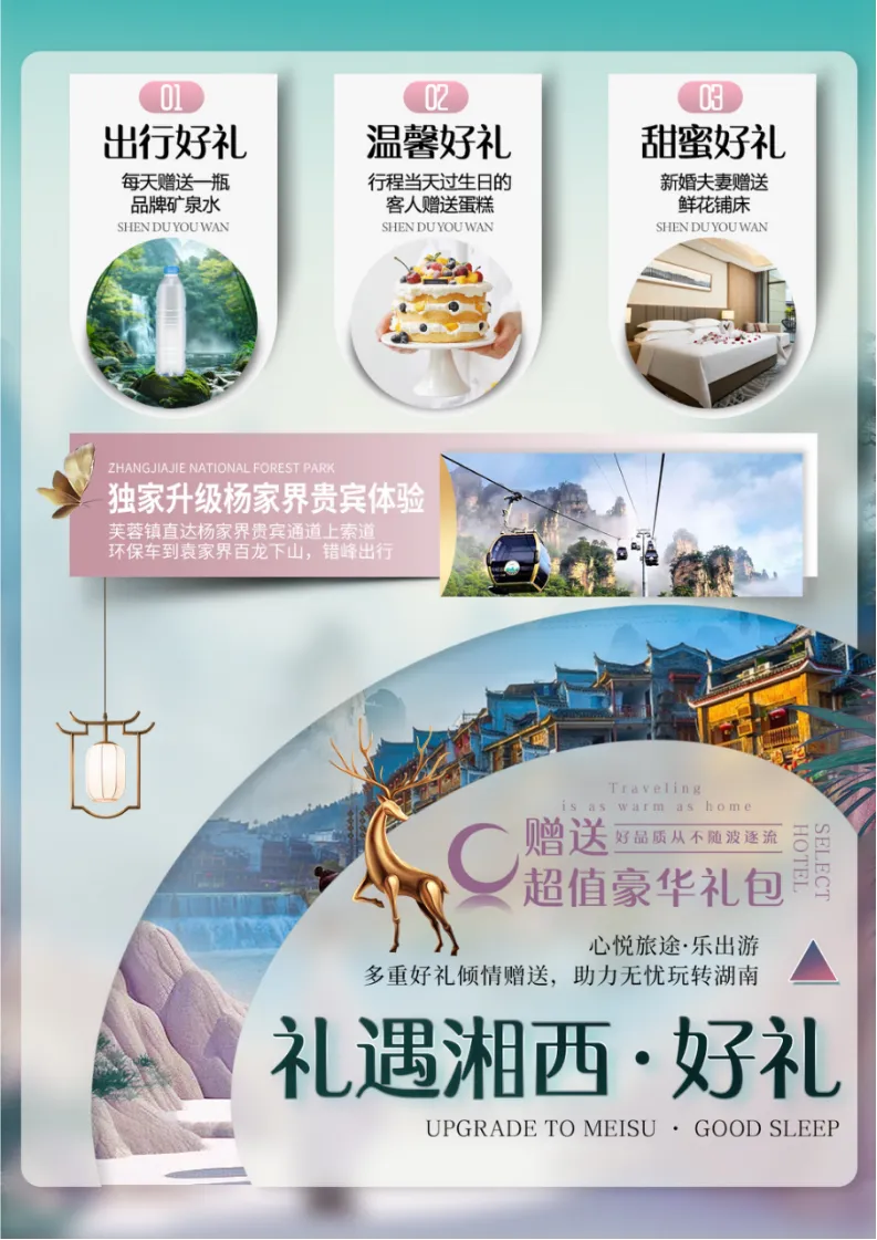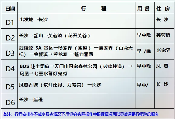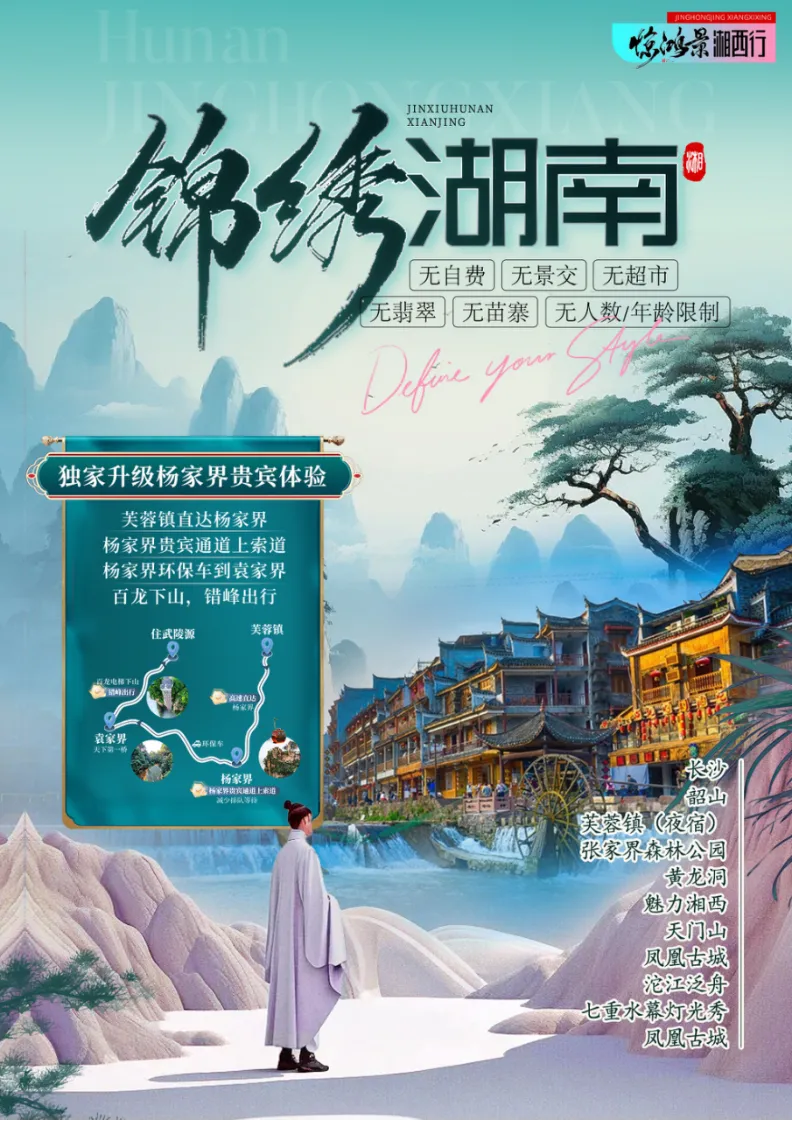 Day3:武陵源景区、张家界国家森林公园→杨家界→袁家界→金鞭溪→黄龙洞 →魅力湘西含餐:早晚餐 住宿:张家界早餐后全程高速前往【武陵源风景名胜区 AAAAA】(核心景区大门票已含),这是我国的第一个国家森林公园,世界自然遗产,世界地质公园,首批国家 AAAAA 景区,游览【杨家界】(赠送杨家界索道单程贵宾通道,减少排队时间),观全球绝版【峰墙长城】,看峰林之绝;环保车抵达【袁家界核心景区】(赠送百龙电梯)《阿凡达》外景拍摄地——哈利路亚山,抵达潘多拉星球--电影《阿凡达》外景拍摄地——【哈利路亚山】探寻影视阿凡达中群山漂浮、星罗棋布的玄幻莫测世界;【天下第一桥】云雾缭绕、峰峦叠嶂、气势磅礴,大小景点应接不暇,忘却归路。