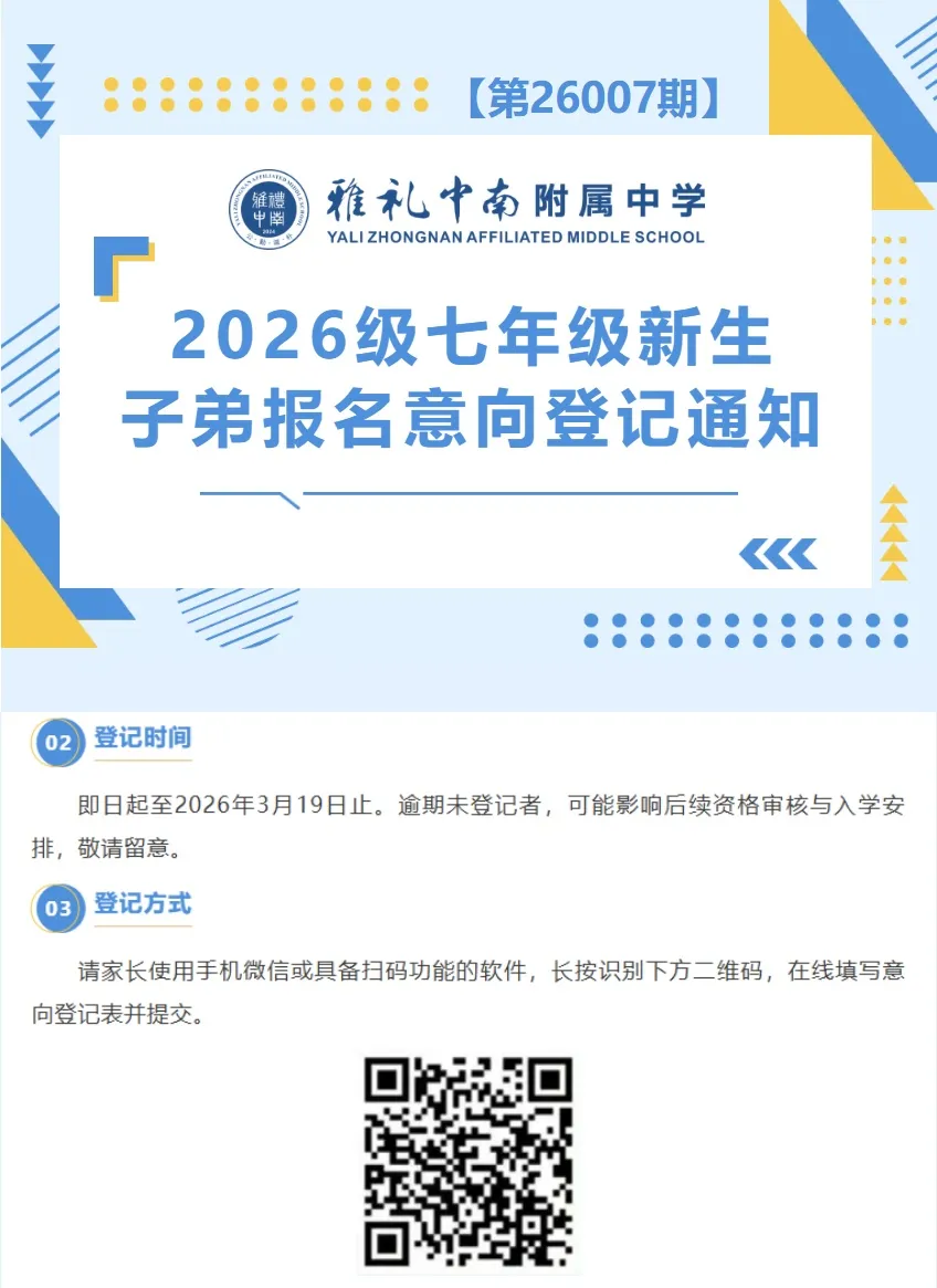 近日,奥利奥老师发现子弟初中雅礼中南附属中学官微发布了2026级七年级新生子弟报名意向登记通知,含岳麓山校区和天心校区,有意向直升这两所学校的中南大学职工(含三代)子弟的小学毕业生们可以开始报名登记了。