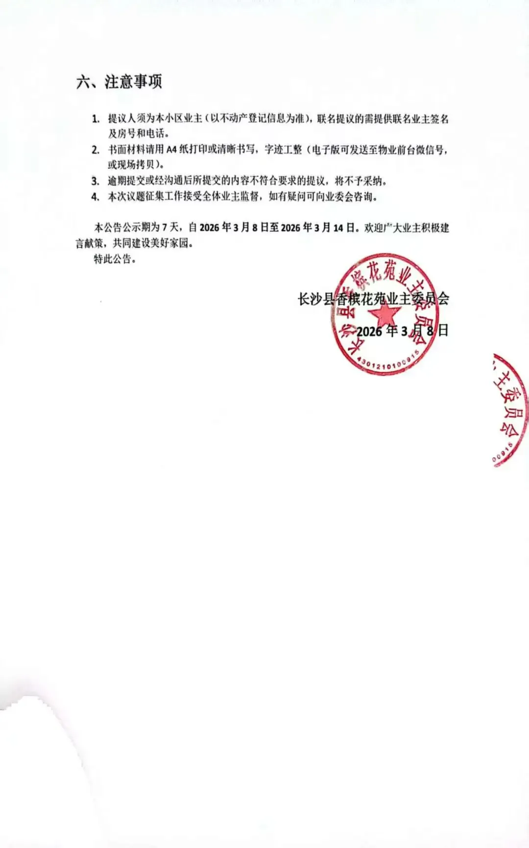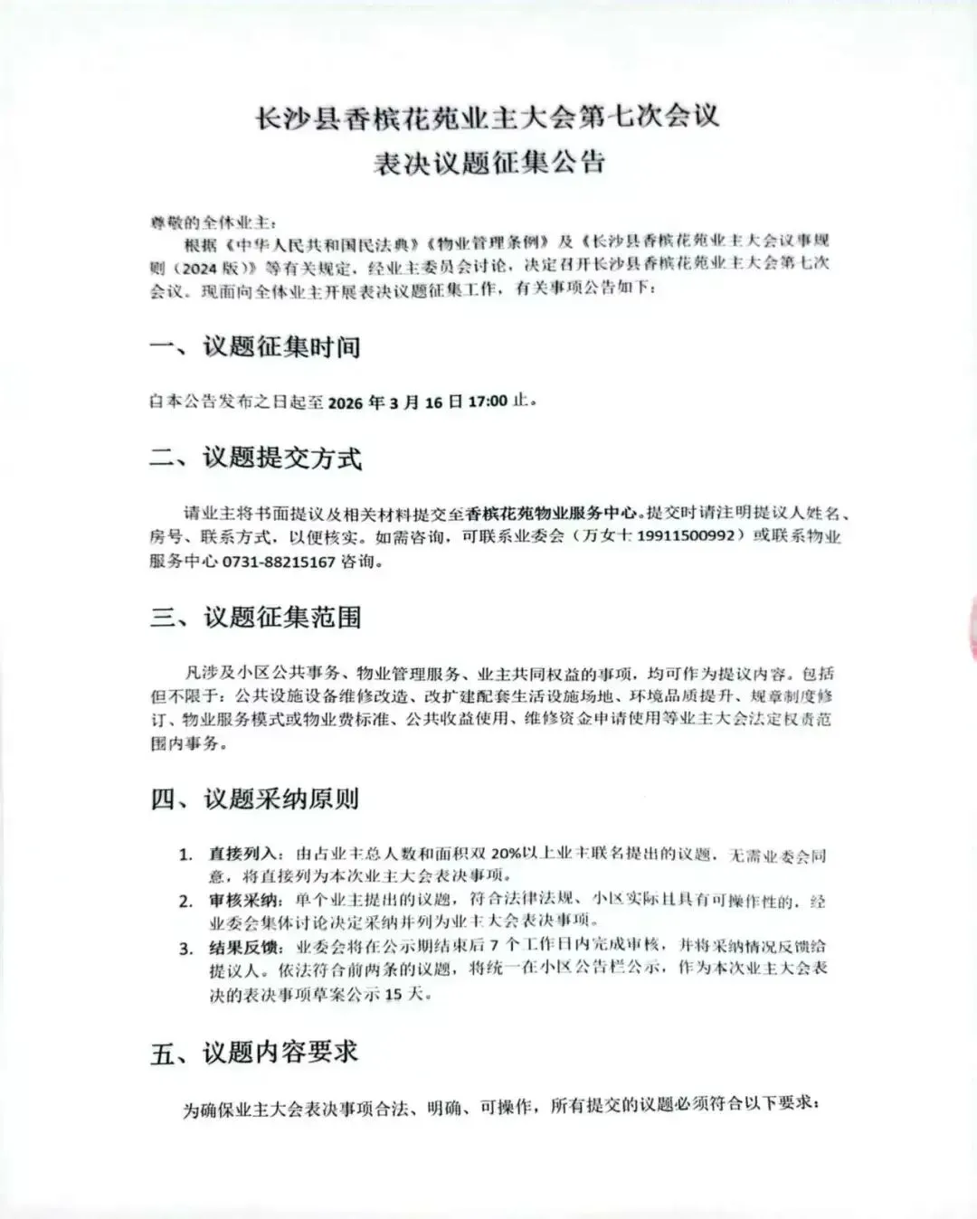 长沙县香槟花苑业主大会第七次会议表决议题征集公告