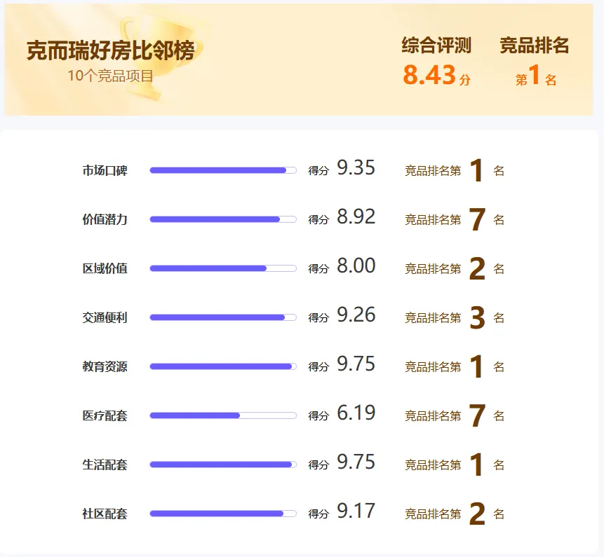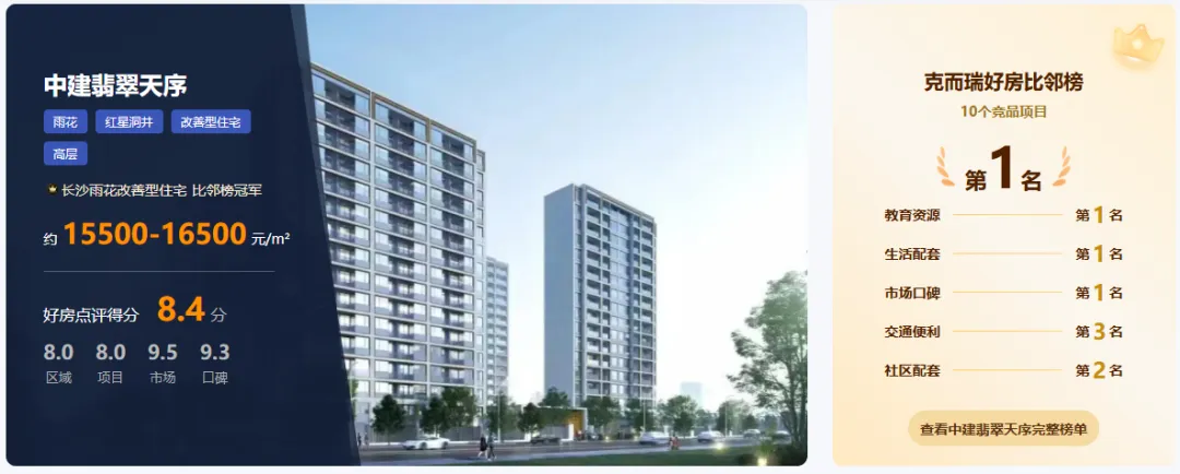在克而瑞好房点评网上,中建翡翠天序综合评分为8.4分,名列“好房比邻榜”第一(对比周边10个竞品项目),其中口碑高达9.3分,市场表现9.5分,项目本身8.0分,口碑为8.0分。这些数字,是项目综合竞争力的体现。