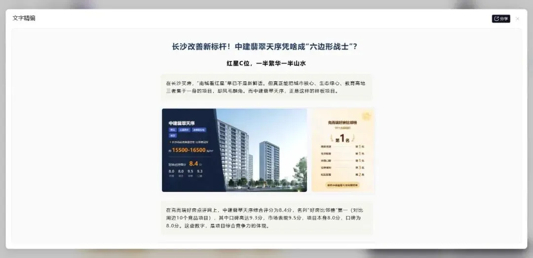 克而瑞·深度智联是地产人的“第二大脑”,房地产行业的首个AI AGENT。它不仅会思考分析,还会提供工作成果,擅长处理您工作中各种场景的任务,可以帮您完成多个复杂工作,是您最佳的AI助手。 红星C位,一半繁华一半山水