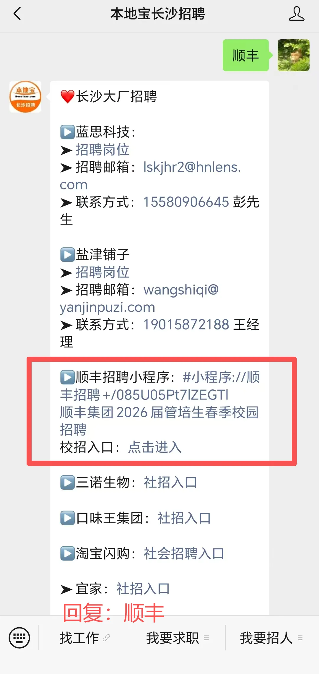 点击下方名片关注【本地宝长沙招聘】公众号,在对话框回复【顺丰】,可直达顺丰集团校招报名入口和查看招聘公告、更多岗位等相关信息。(本地宝仅提供报名入口,非主办方)