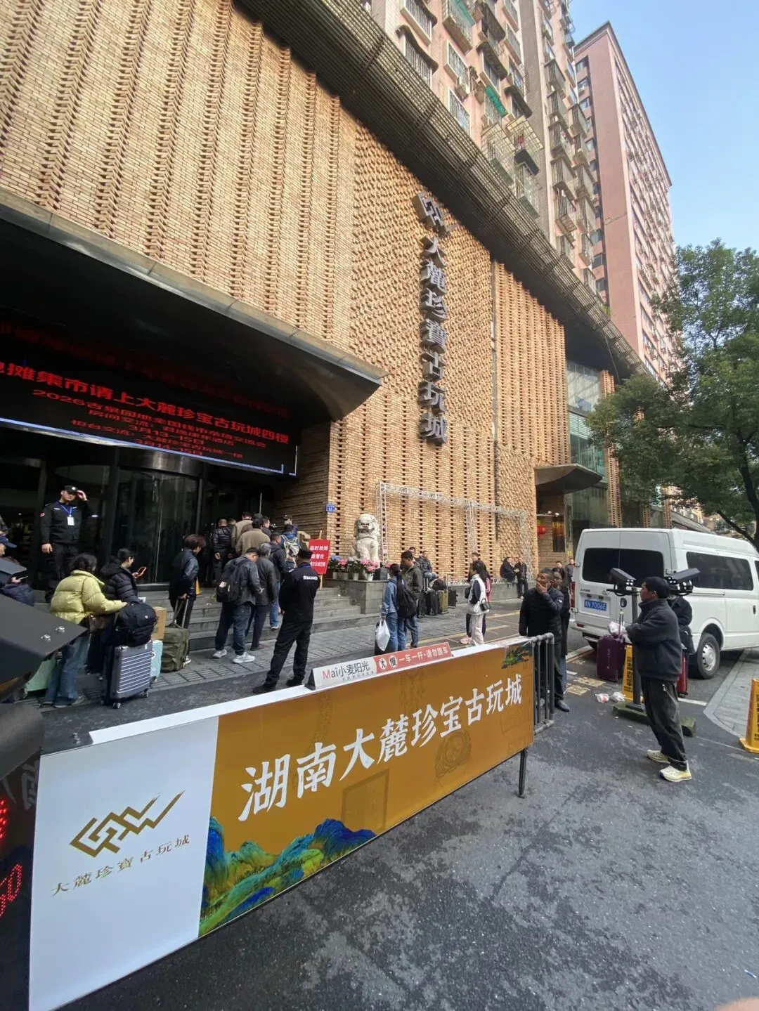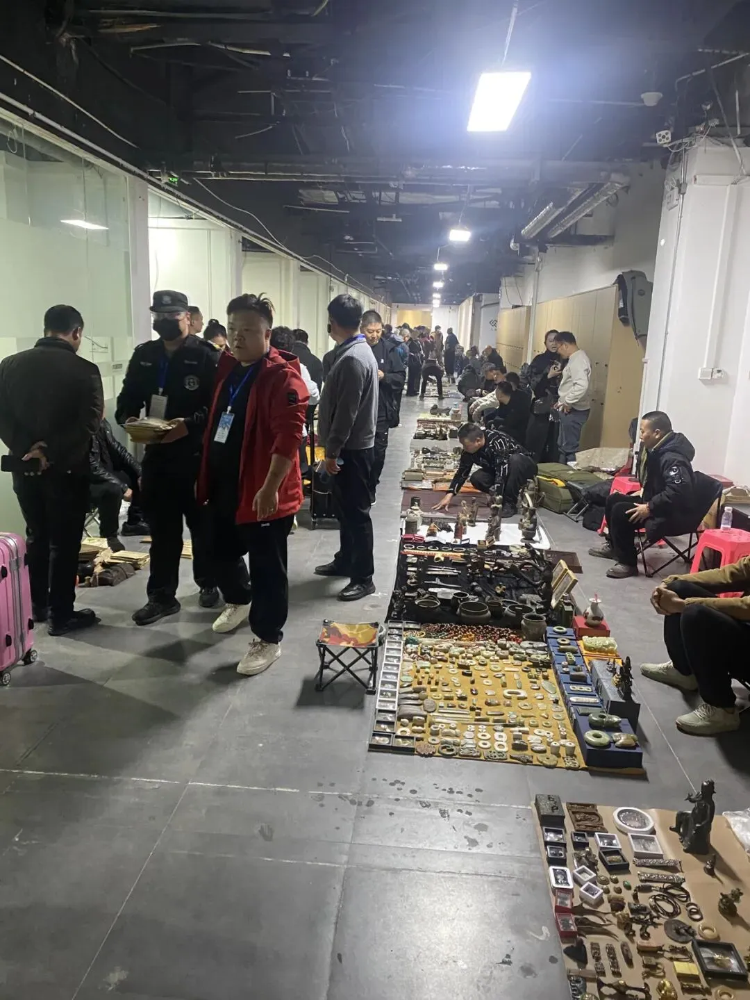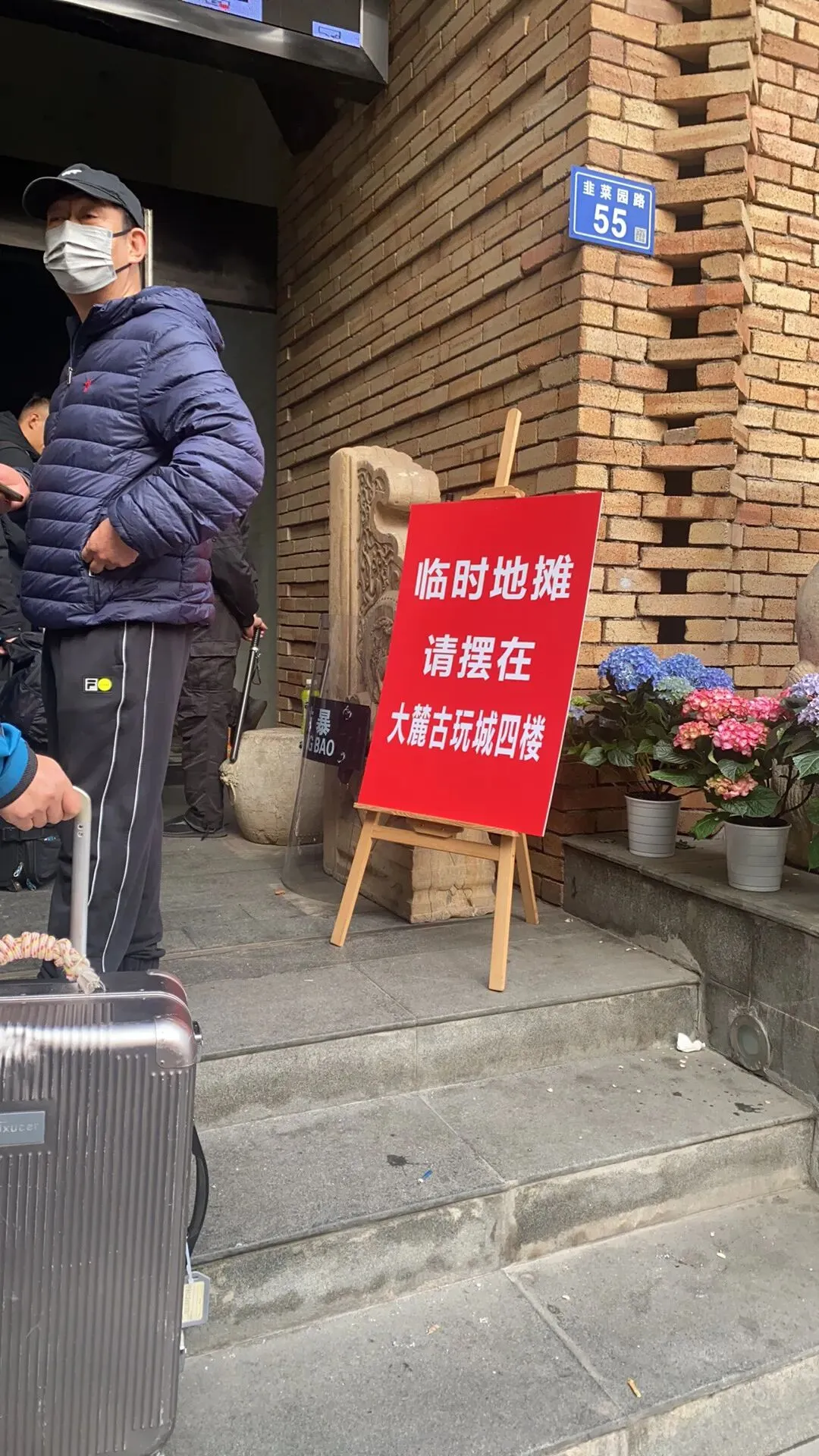 因为今天不让把摆地摊,人们挤在大麓古玩城门口。到古玩市场四楼摆摊。