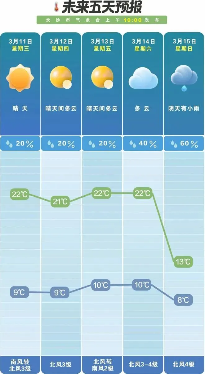 本周中前期(11日至14日),是天气最舒适的 “黄金时段” ,最高气温将稳稳站上20℃以上,其中周三、周五可达22℃。