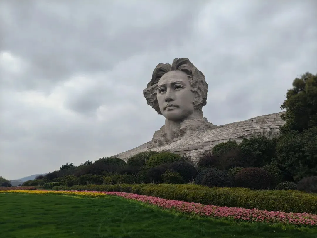 洲头问天台广场,青年毛泽东的巨型雕像是地标景点,边上设有武警岗,尽管非节假日这里还是聚集了很多游客。