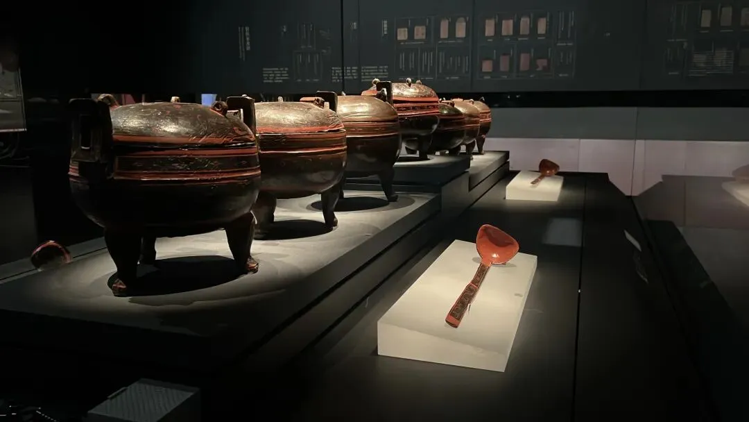 诸侯漆鼎七件,鼎为盛食器,不能加热,匕置于鼎中,两者配套使用,匕用于搅拌鼎内食物或取食。