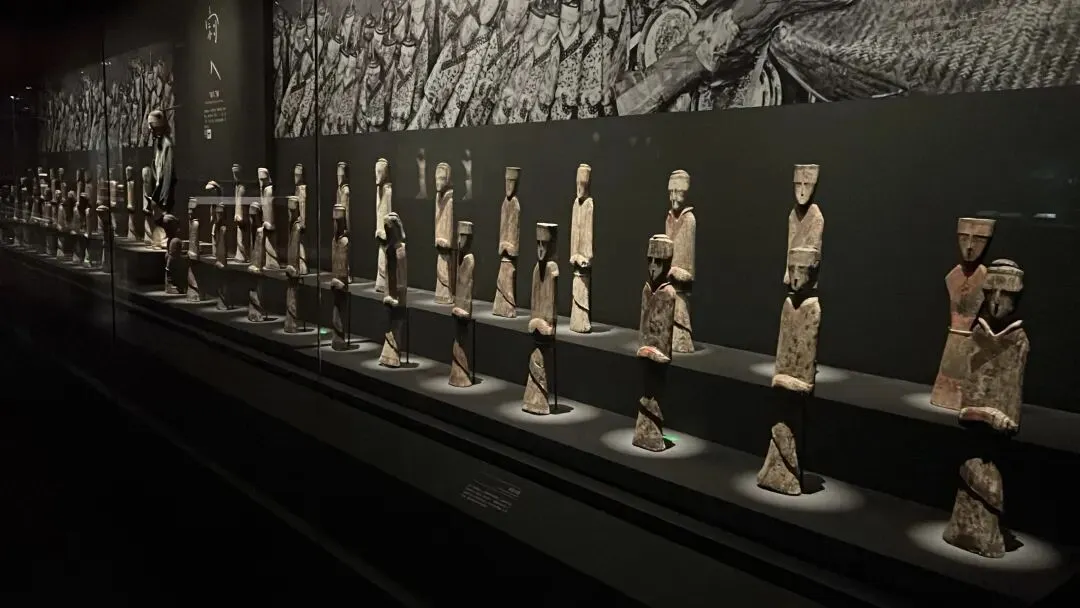 奏乐俑,代表着汉代贵族的一批能歌善舞及擅长乐器的艺人,歌俑头梳盘髻,屈膝吟唱,是轪侯家族生活的真实写照。彩绘木俑,是一群从事各种杂役的劳动者,突显出男女不同的发型装束,有趣多姿,有浓重的生活气息。