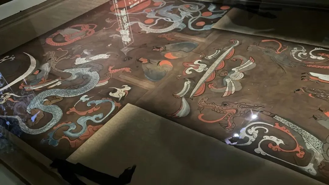T型帛画,名为“飞衣”,全长2.05米,由三块单层细绢拼成,分成天上、人间、地下三部分,图像造型声东击西,色彩鲜明和谐,有很高的思想与艺术价值,在中国绘画史上有重要意义。天上描绘太阳、月亮、烛龙、飞龙及天国守门神等;人间描绘辛追夫人在三个侍女簇拥下缓缓上天;地下描绘巨人托举大地。帛画表达了汉人对天国的浪漫的想象与生命延续的渴望。