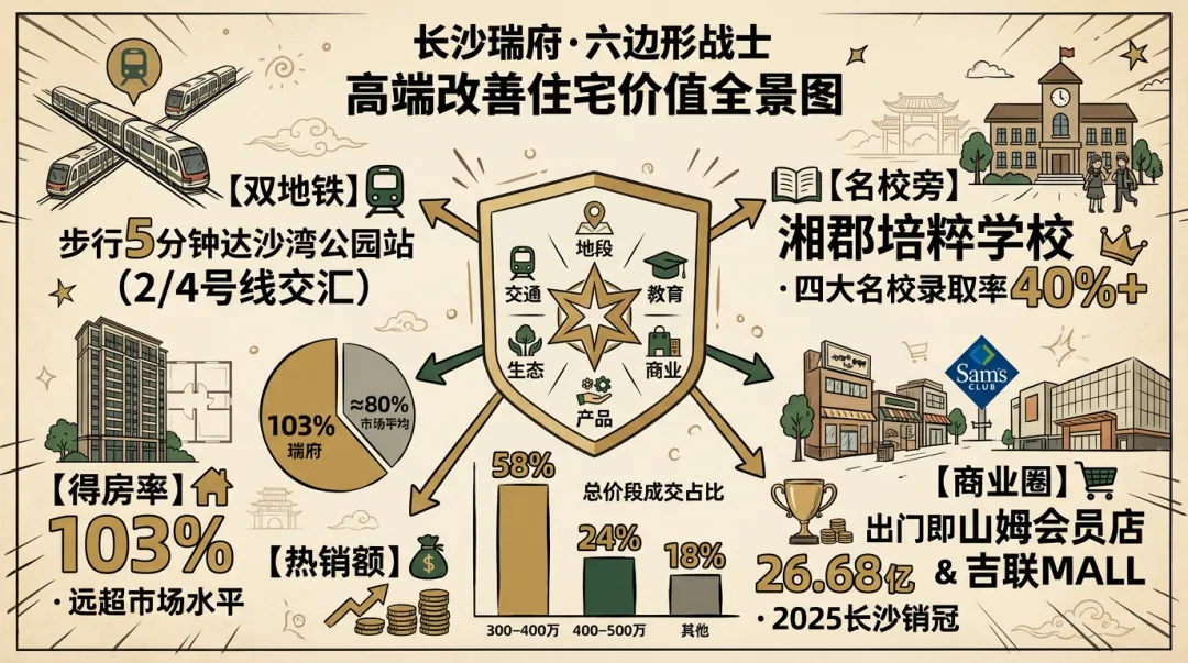 在2025年长沙楼市整体趋稳的背景下,长沙瑞府以26.68亿元的成交额强势登顶全市销售金额榜首,成为唯一突破20亿大关的项目。这个成绩背后,不是偶然,而是“六边形战士”产品力的全面兑现。