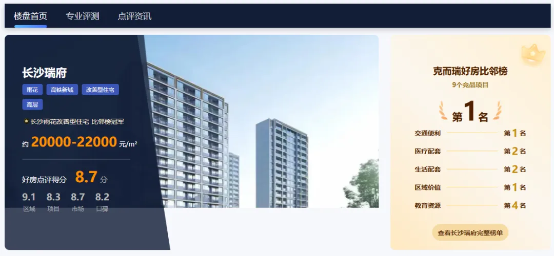 在克而瑞好房点评网上,长沙瑞府综合评分为8.7分,名列“好房比邻榜”第一,其中口碑高达9.1分,市场表现8.7分,项目本身8.3分,口碑为8.2分。这些数字背后,是扎实的产品力支撑。