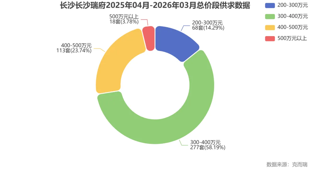 从成交结构看,瑞府客户主要集中在300万至500万总价段。数据显示,2025年4月至2026年3月,项目300万至400万房源成交277套,占比58%;400万至500万成交113套,占比24%。这说明其主力客群为高购买力改善群体。