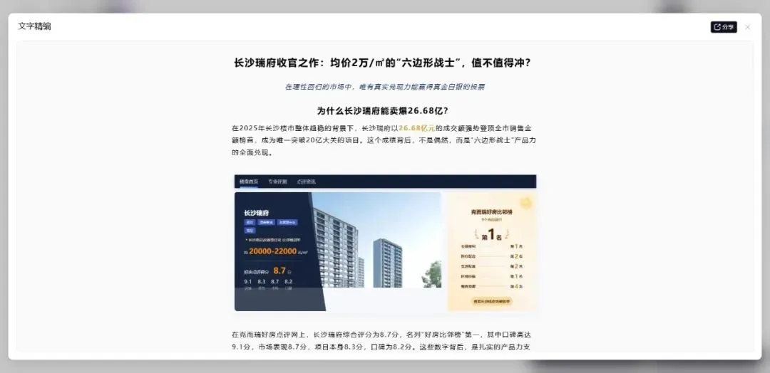 克而瑞·深度智联是地产人的“第二大脑”,房地产行业的首个AI AGENT。它不仅会思考分析,还会提供工作成果,擅长处理您工作中各种场景的任务,可以帮您完成多个复杂工作,是您最佳的AI助手。 在理性回归的市场中,唯有真实兑现力能赢得真金白银的投票