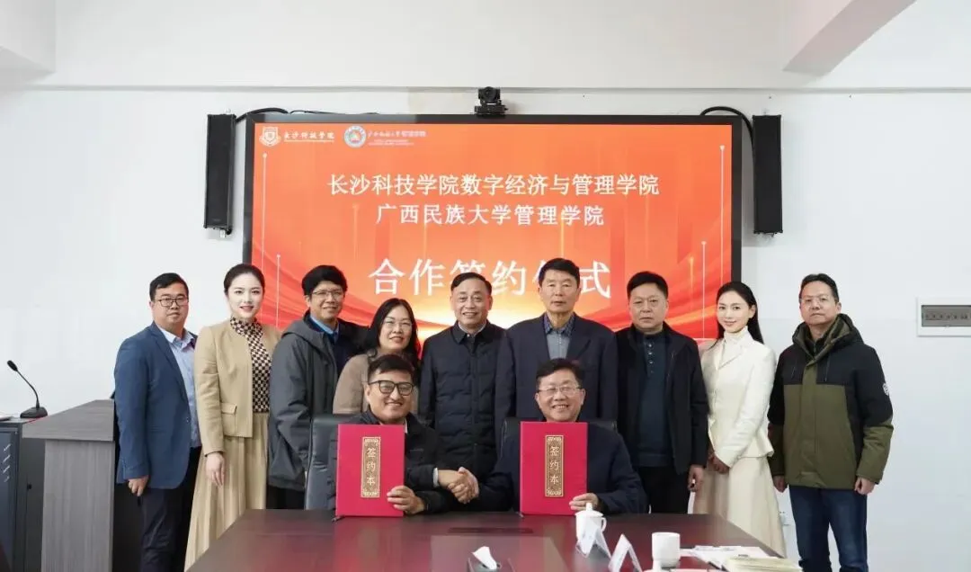 随后,管理学院一行与长沙科技学院进行座谈交流,长沙科技学院张昌凡院长等领导和老师参会。数字与经济学院凌智勇院长介绍了长沙科技学院、数字经济与管理学院的专业设置、招生规模、师资队伍以及教育教学工作。管理学院高斌院长介绍了广西民族大学和管理学院在人才培养、科学研究、社会服务、文化传承以及国际交流等方面的情况。双方重点就加强学生交流通道建设,开展科研合作和技术攻关,拓展社会服务和业务培训、开拓东盟小语种+专门档案人才培养等未来合作方向进行了深入交流和热切展望。最后举行了隆重的合作框架协议签约仪式,双方合影留念。
