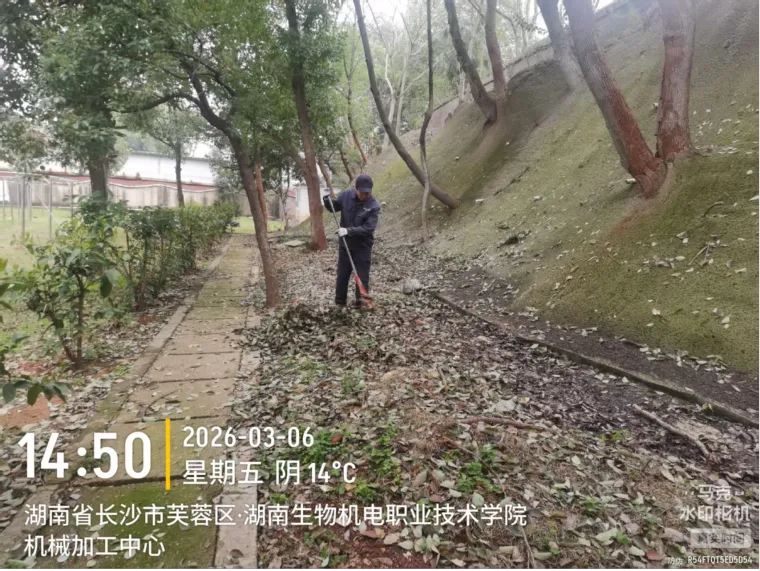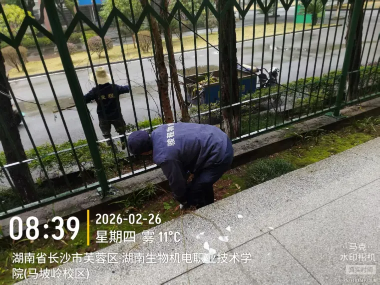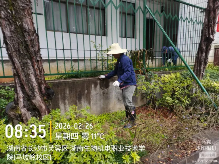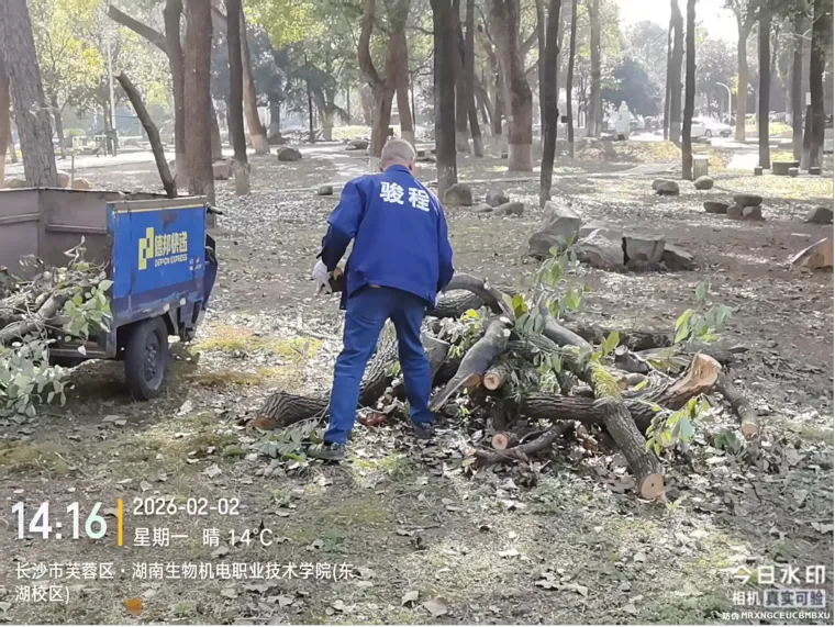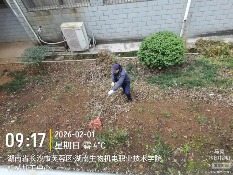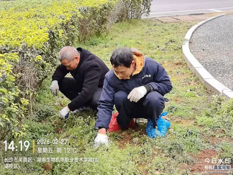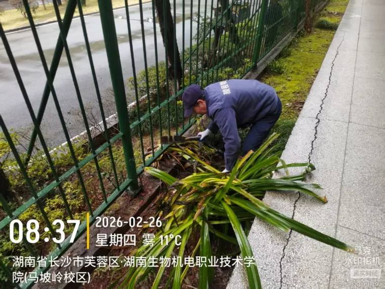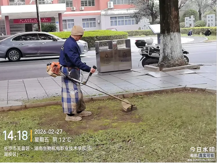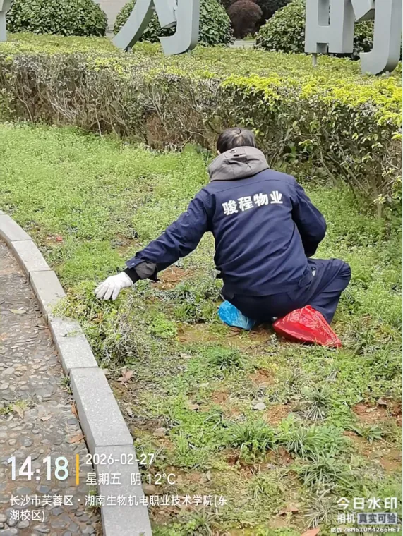 清理低空危枝2次,校区补栽补种1次;绿化重点区域落叶清扫2次;草坪修剪;清理草坪内杂草、杂物及白色垃圾。