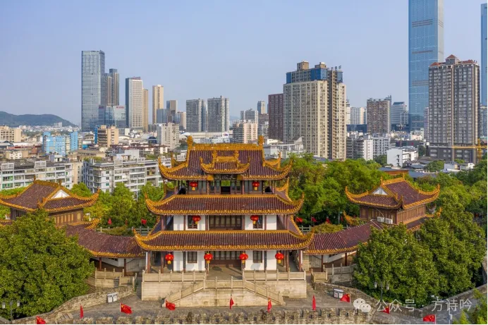 自古长嗟客丨“一为迁客去长沙,西望长安不见家”,唐代李白《与史郎中钦听黄鹤楼上吹笛》名句橘洲意气丨橘子洲,“独立寒秋,湘江北去,橘子洲头”近代毛泽东《沁园春·长沙》名句阁据天心丨天心阁,自古享有“潇湘古阁、秦汉名城”美誉亭曰爱晚丨爱晚亭,据唐代杜牧《山行》名句“停车坐爱枫林晚,霜叶红于二月花”更名衡云荏苒丨衡山之云,“为怀贾谊到长沙,又过衡云湘水涯”宋代戴复古《衡阳度岁》诗句作于2019年4月. 长沙