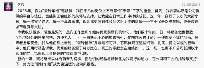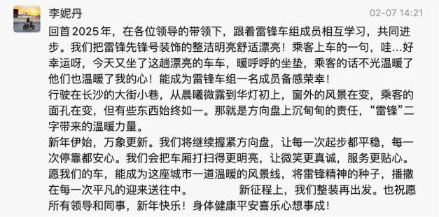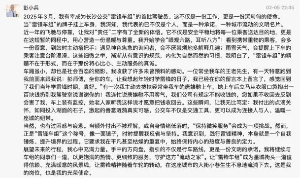 李妮丹和王俊强的故事,只是“雷锋车组”的缩影。这一年,雷锋车组的故事,从未离开公众的视野。从省级媒体聚焦车厢里的“雷锋服务区”,到市级平台讲述驾驶员与乘客的暖心双向奔赴;从本地融媒体打卡“会呼吸的车厢”,到社交平台上市民自发分享的乘车感动瞬间,雷锋车组的每一次暖心服务、每个温情瞬间,都被镜头记录、被文字传颂。他们的事迹,不仅成为长沙公交服务升级的生动写照,更成为这座城市文明向善的鲜活缩影,让雷锋精神在新时代的长沙,有了最接地气的表达,也让文明公交的形象深入人心。