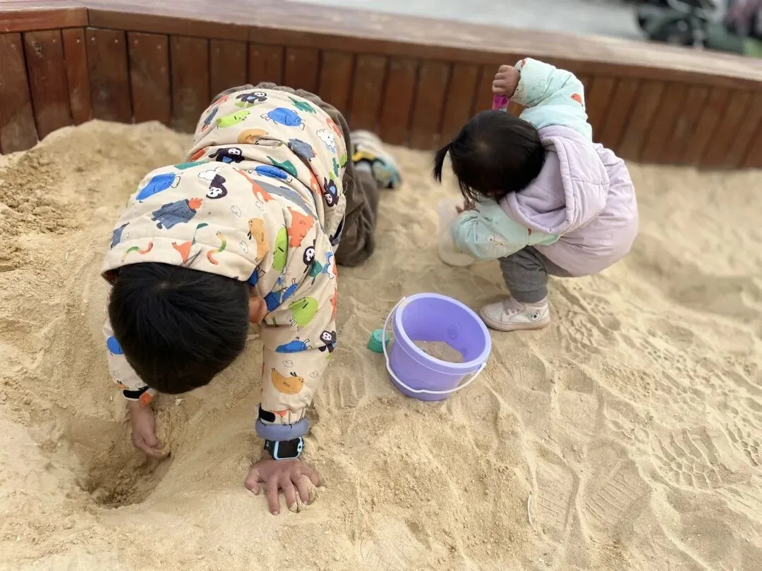 这里的沙更像泥沙混合,但一点不影响孩子快乐。大一点的娃喜欢从湖边引水到沙里,安全性高;小宝宝有草帽式遮阳棚,躲在下面挖沙,一片沙就能玩很久。