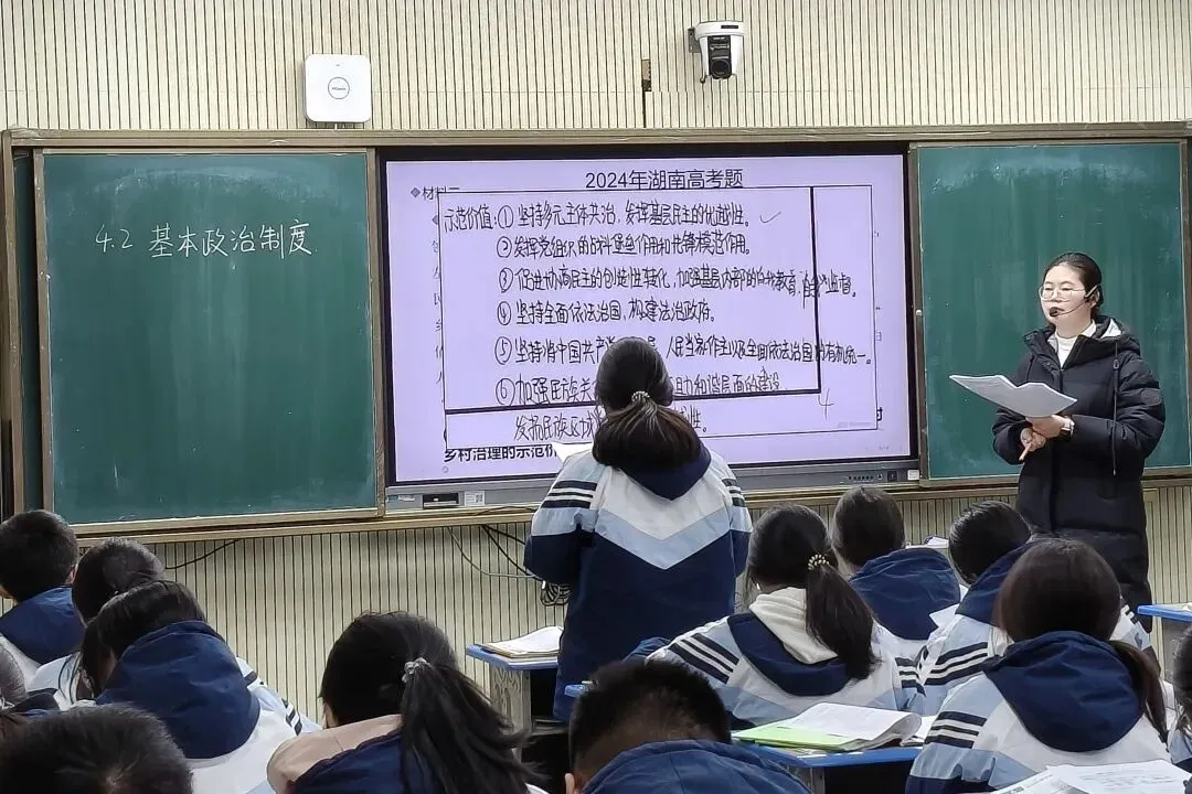 与此同时,在懋勤楼四楼的现代化录播室里,政治学科的研讨正弥漫着思想的张力。长沙麓山国际昌济中学青年教师刘地与2311班的同学一起,正在深入复习《专题四 人民当家作主》。