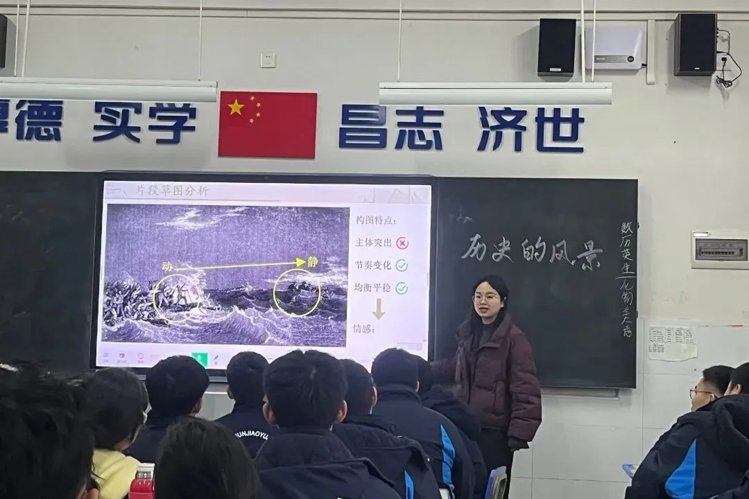 在此基础上,刘老师进一步分析影响历史画创作的多元因素,让学生认识到艺术作品既是艺术家个人情感的表达,也深深烙印着特定的社会背景与时代思潮。通过这一过程,不仅提升了学生对图像语言的感知力,也在思辨中逐步建立起尊重历史、理解多元的文化价值观,从而涵养更为深厚的人文精神。