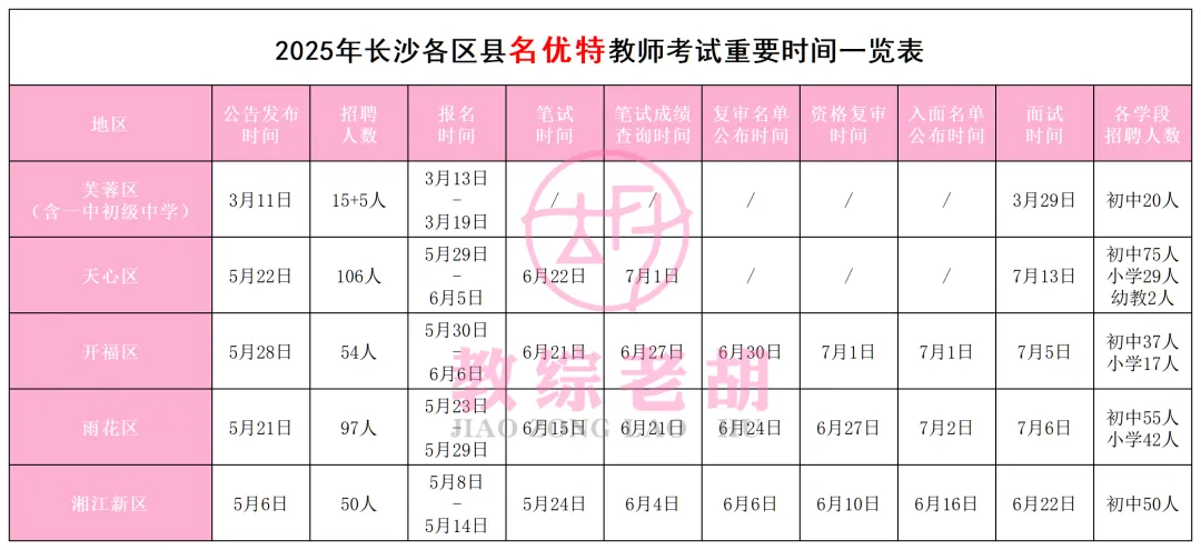 各位备考长沙名优特教师的老师,2026 年招聘已进入新阶段,回顾 2025 年考情,能帮大家精准把握考试节奏、明确备考方向!2025 年长沙芙蓉区、天心区、开福区、雨花区、湘江新区五大核心区域名优特教师招聘已全部结束,各区县考试时间节点、招聘规模及学段分布差异明显。为方便大家参考往年规律、针对性备考,现将核心考情梳理如下:芙蓉区(含一中初级中学)