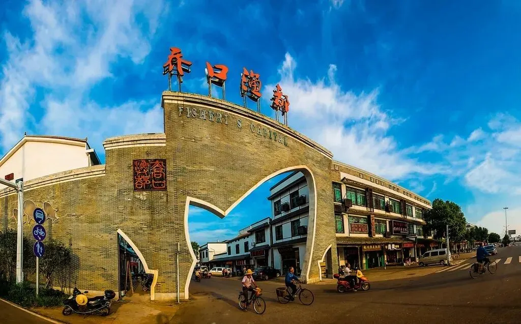 “钓鱼要到团头湖,吃鱼要吃乔口鱼。”沿着雷锋大道往北走,便能遇见腾跃状鱼形大门,旁边赫然写下“乔口渔都”四个大字。