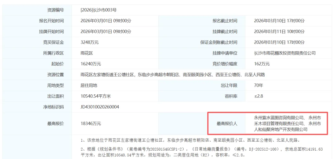 该地块经3家房企13轮激烈竞拍,由永州紫水蓝图咨询有限公司、永州市禾木项目管理有限责任公司、永州市人和仙聚房地产开发有限公司以18346万元摘得,成交楼面价6216元/㎡。