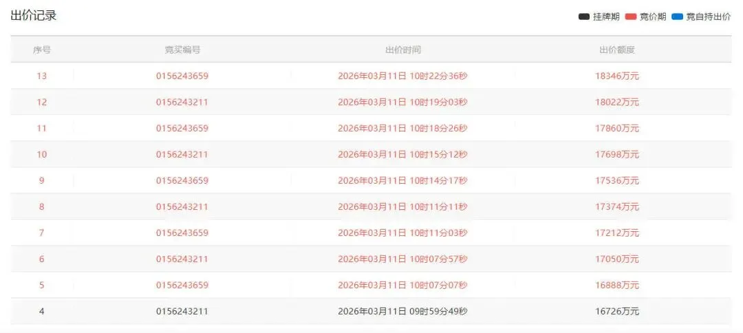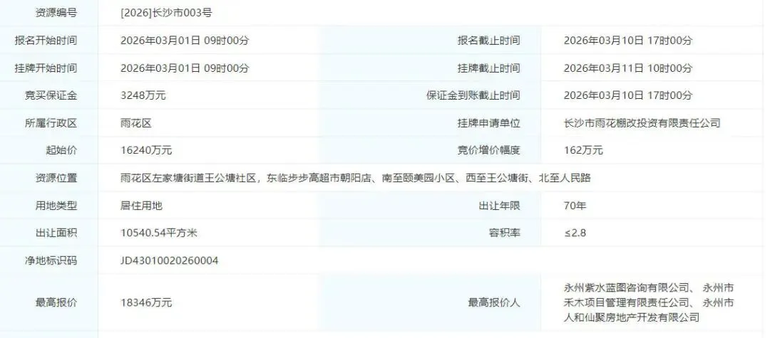 【2026】长沙市003号地,历经13轮竞价,最终由永州紫水蓝图咨询有限公司、 永州市禾木项目管理有限责任公司、 永州市人和仙聚房地产开发有限公司拍下,成交总价18346万元,溢价率13%,楼面价6216元/㎡。