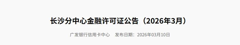 2026年3月10日广发银行信用卡中心发布《长沙分中心金融许可证公告(2026年3月)》,宣布经国家金融监督管理总局湖南监管局批准,广发银行股份有限公司信用卡中心长沙分中心因调整办公场所换领《中华人民共和国金融许可证》,具体如下: