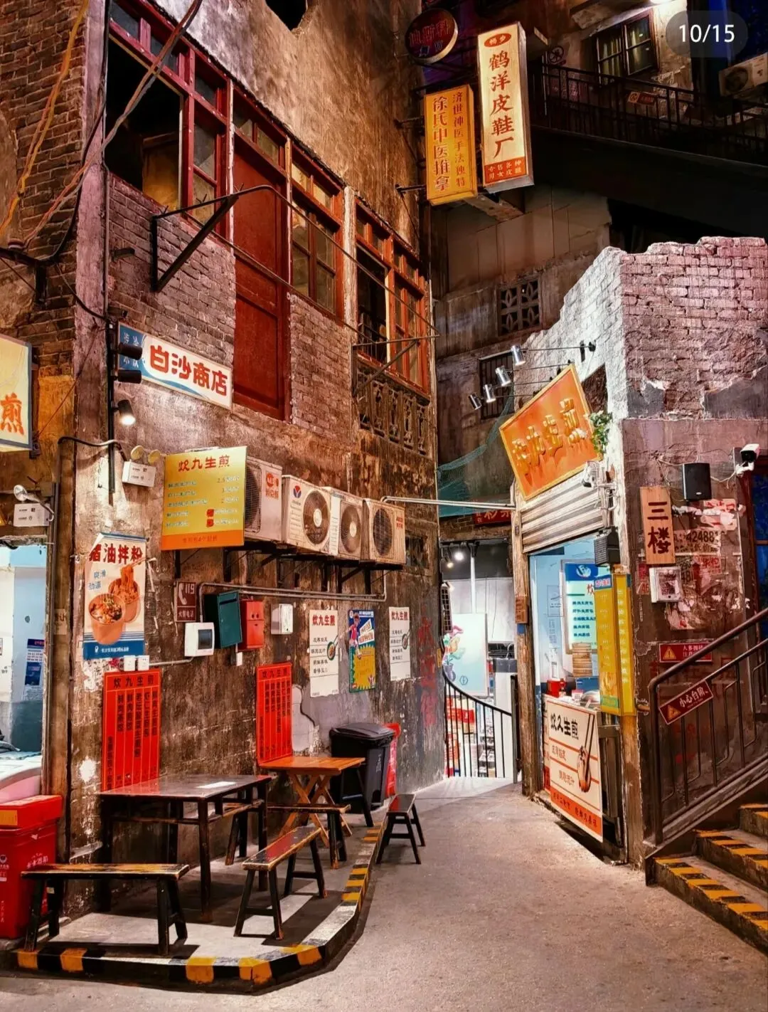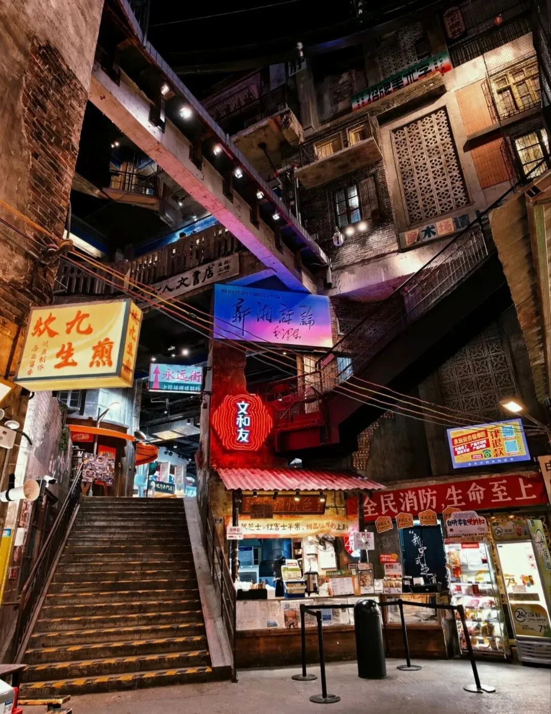 先港环境,真的不是简单装修,是把一整座老长沙城搬进来哒。六层楼、两万多平,二十万块老砖砌墙,十万件老物件摆满角角落落,斑驳墙面、褪色霓虹、外露楼道、晾衣绳上的花衬衫,还有红星美发厅、录像厅、百货商店,连电线杆都是旧的,一眼望过去,就是小时候外婆家楼下的样子。