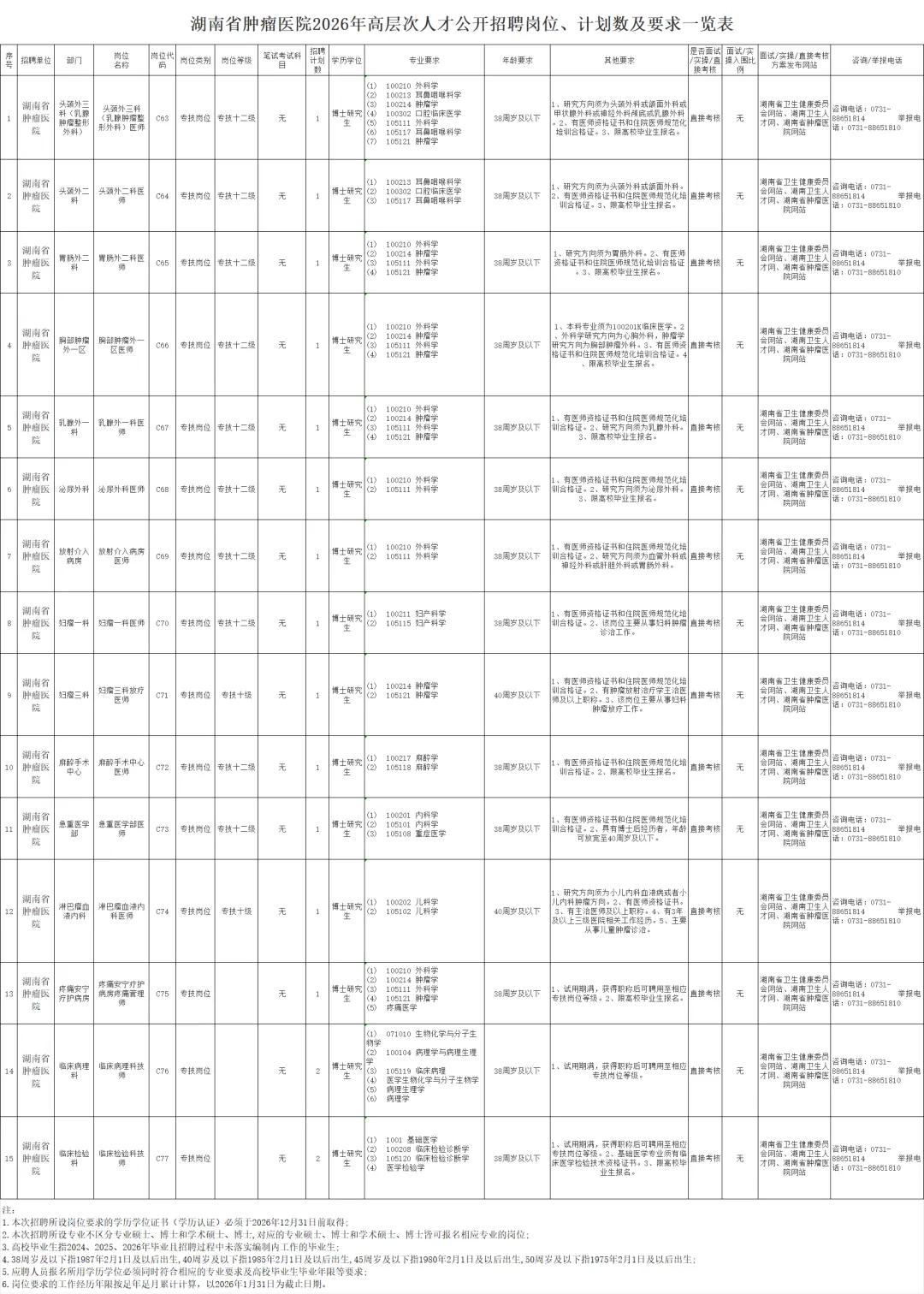 根据《事业单位人事管理条例》《事业单位公开招聘人员暂行规定》《关于进一步做好事业单位公开招聘工作的通知》等事业单位公开招聘有关政策,结合湖南省肿瘤医院工作需要,2026年面向社会公开招聘事业单位工作人员。现将具体招聘方案公告如下: