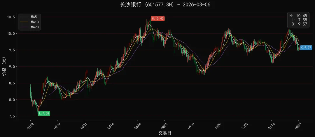 长沙银行(601577)整体呈现宽幅收敛震荡走势,股价从阶段低点7.58元启动攀升,最高触及10.45元后,进入多轮冲高回落的震荡周期,整体波动区间为7.58-10.45元,区间振幅近38%。