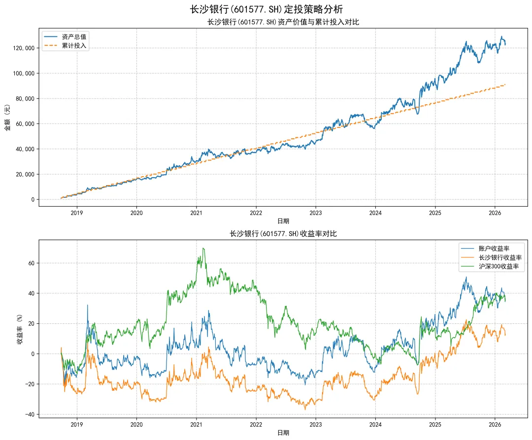 回测周期为2018年9月至2026年3月(7.44年),执行每月定投1000元策略,累计投入91000元,最终资产总值达123313.54元。总收益率35.51%,年化收益率4.17%,显著跑赢同期长沙银行个股(总收益12.99%、年化1.66%),仅略低于沪深300指数(总收益36.38%、年化4.26%)。定投有效平滑了个股震荡波动,在长期投资中展现出比直接持有个股更优的收益效果。