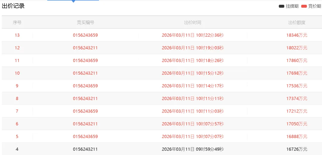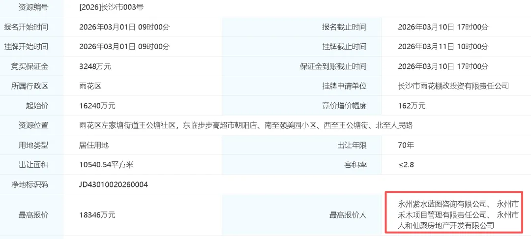 2月底,广州马场地块掀起一场年度“史诗级”土拍!经过243轮、9小时的鏖战,越秀成功竞得马场1期地块,总价236亿元,再现“地王”。今日(3月11日)上午,长沙迎来2026年首场住宅地块拍卖,同样竞拍激烈,遭3家房企抢夺,开篇即王炸!该地块编号为[2026]长沙市003号,位于雨花中心板块,地理位置十分优越,周边配套齐全,在竞拍开始前已有4笔出价!正式开拍后,3家房企不断加价,竞拍时长近半小时。最终经过13轮出价后,被永州紫水蓝图咨询有限公司、 永州市禾木项目管理有限责任公司、 永州市人和仙聚房地产开发有限公司竞得,成交总价18346万元,成交楼面价6216元/㎡,溢价率13%。该宗地即市场备受关注的王公塘地块。位于雨花区左家塘街道王公塘社区,东临步步高超市朝阳店、南至颐美园小区、西至王公塘街、北至人民路。地块在去年11月进行了“商改住”调规公示,调规完成后于2月9日挂牌,出让面积10540.54㎡,容积率≤2.8,起始总价16240万元,起拍楼面价5503元/㎡。将以“稀缺高端改善型住宅”为特色,拟打造集商业服务、文化娱乐、高档居住为一体的全体验式综合体。
