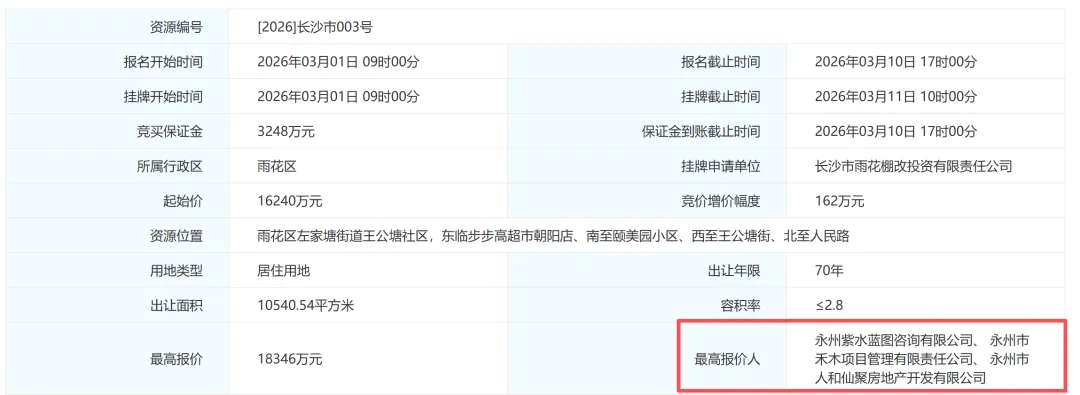 红网时刻新闻3月11日讯(记者 黄怡萍)今日,长沙土地市场迎来马年“开门红”。经过13轮竞价,位于雨花区核心地段的[2026]长沙市003号地块成功出让,成为马年长沙市首宗成交的居住用地,为春日楼市注入了一剂活力。长沙市国土资源网上交易系统显示,[2026]长沙市003号地块位于雨花区左家塘街道王公塘社区,东临步步高超市朝阳店、南至颐美园小区、西至王公塘街、北至人民路。该地块地处长沙市内环高效集约的区域,周边商业繁华、交通便利(双地铁口),生活配套成熟,是典型的主城稀缺住宅用地。地块出让面积10540.54平方米(合15.81亩),规划为二类居住用地(R2),容积率≤2.8。该地块起始价16240万元,折合起始楼面价约5503元/平方米。最终,该地块由永州紫水蓝图咨询有限公司、永州市禾木项目管理有限责任公司、永州市人和仙聚房地产开发有限公司联合体以总价18346万元竞得,溢价率13%,最终成交楼面价约6216元/平方米。