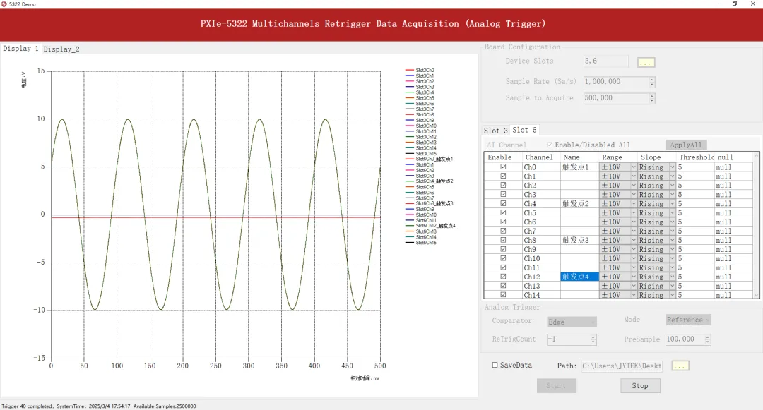 简仪科技推出的创新功能“多卡任意通道模拟触发同步采集”,可自由指定任意通道作为模拟触发源,可实现高精度、高灵活性的同步测量系统,广泛应用于多路信号监测和高通道密度触发采集场景。现场将演示使用4张5322实现任意通道模拟触发采集。
