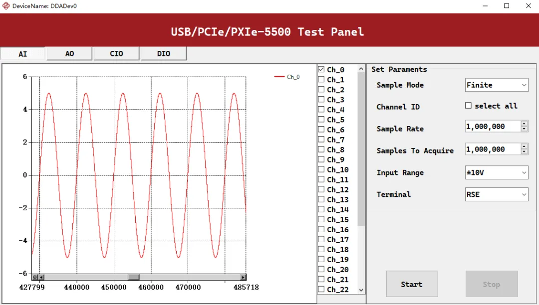 支持模块仪器中各项功能,包括模拟数据采集、模拟波形输出、数字 I/O、计数器测量与输出