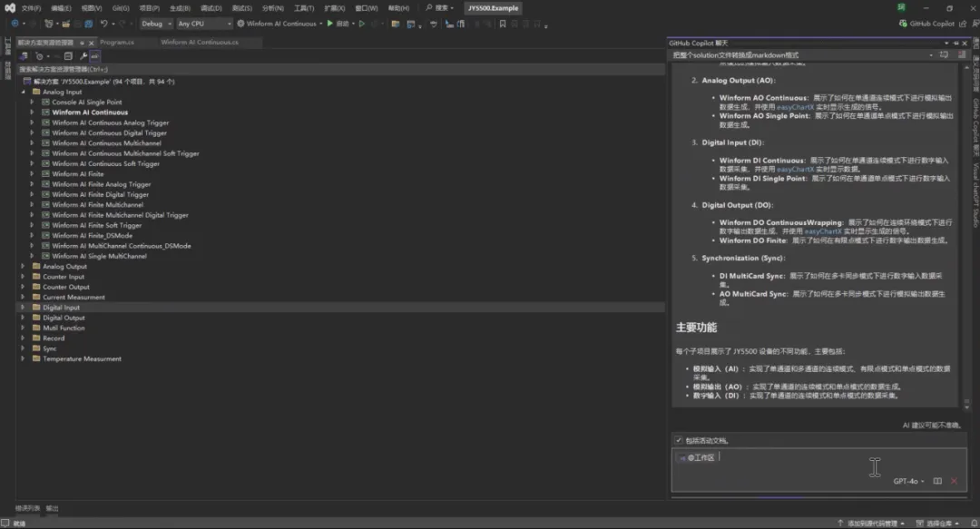 简仪科技致力于打造基于开源技术的锐视测控平台®(SeeSharp Platform),建设测控开源生态圈。得益于AI技术与微软开发工具(Visual Studio)的紧密连接,锐视测控平台®在AI技术的快速演进中展现出独特优势。锐视测控平台®在微软的Visual Studio环境下开发,天然适配主流AI技术。通过统一的仪器调用方法,让AI能够轻松解析硬件逻辑,实现自动化编程、优化和调试。现场演示AI生成板卡采集程序并优化代码。
