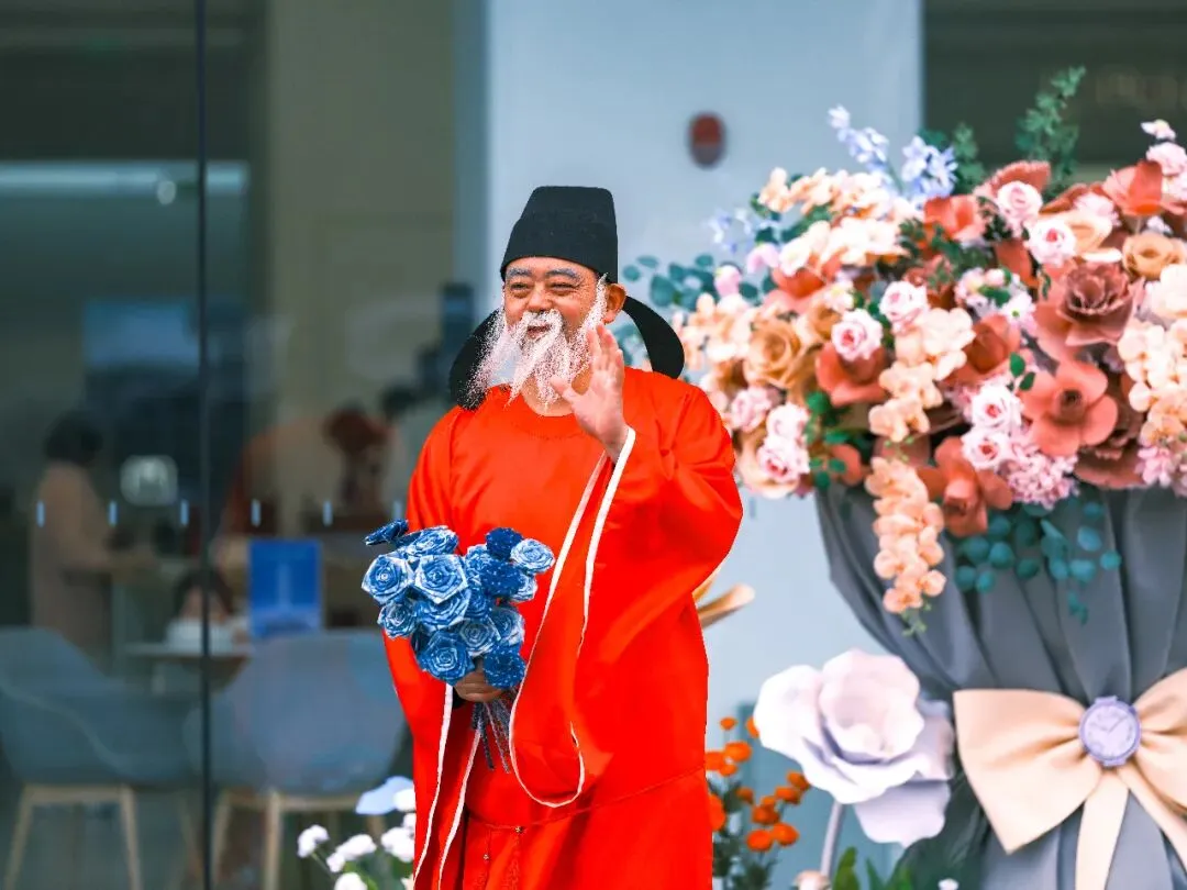 2026年3月8日妇女节当天,他再次现身长沙商圈,派发非遗扎染花,一句“一笑出门去,千里落花风”令路人倍感惊艳。