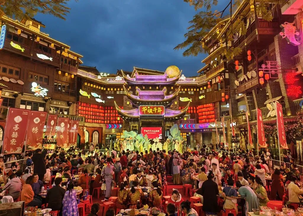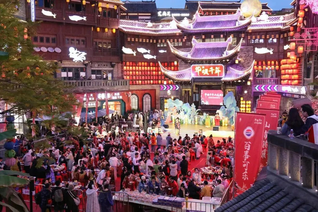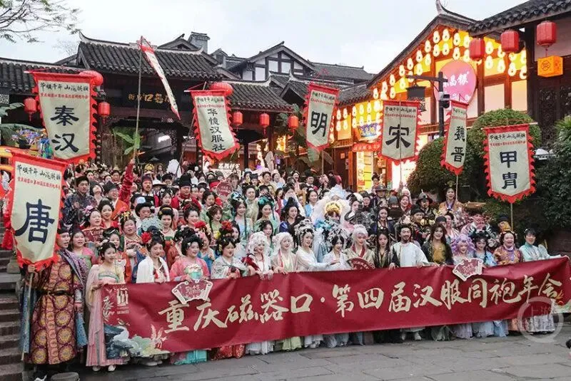 随着夜幕降临,磁器口后街吊脚楼广场升腾起火锅的香气,同袍夜宴热闹开席,数百位汉服同袍盛装齐聚,赏歌舞霓裳,品火锅鲜香,欢度国风夜宴,弘扬传统文化。
