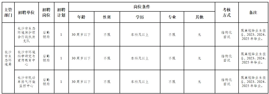 此次招聘岗位3个,计划招聘人数3名,均为工勤辅助人员。详见附件《2026年长沙市生态环境局所属事业单位公开招聘普通雇员岗位表》。
