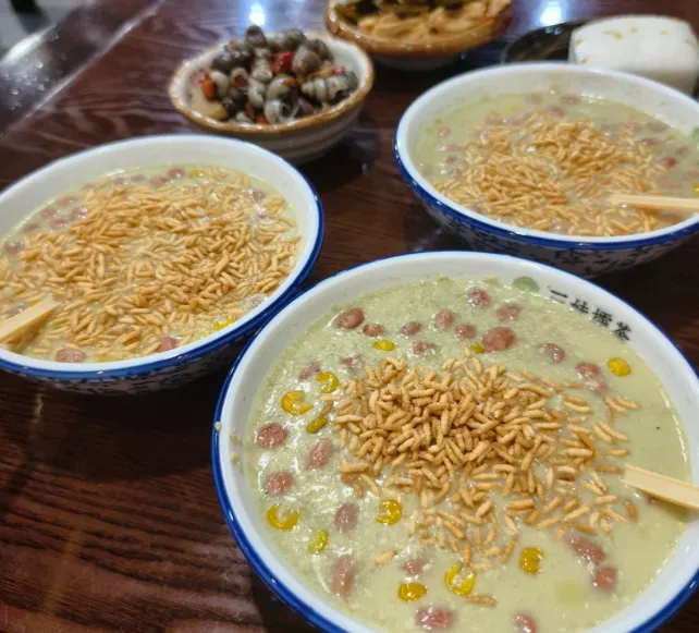 益阳擂茶做法:这东西讲究个"擂"劲。抓一把生茶叶、生姜、生花生,丢进特制的陶钵里。用木棒使劲擂,转着圈磨,直到磨成细腻的泥状。这时候冲入滚烫的开水,"滋"的一声,香气炸开。撒点炒米和芝麻,趁热喝,暖胃又醒神。
