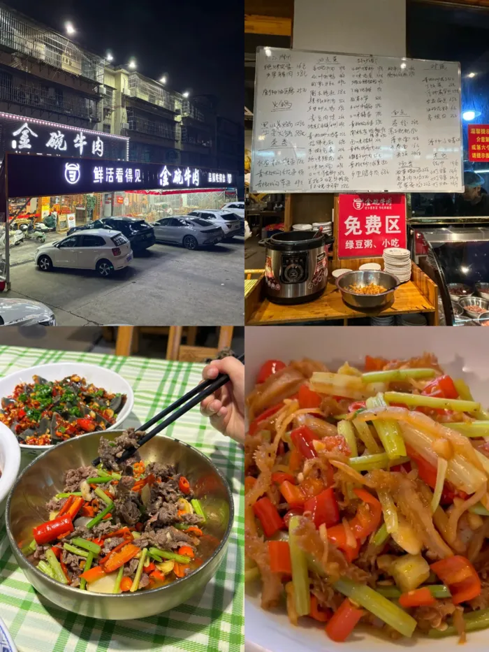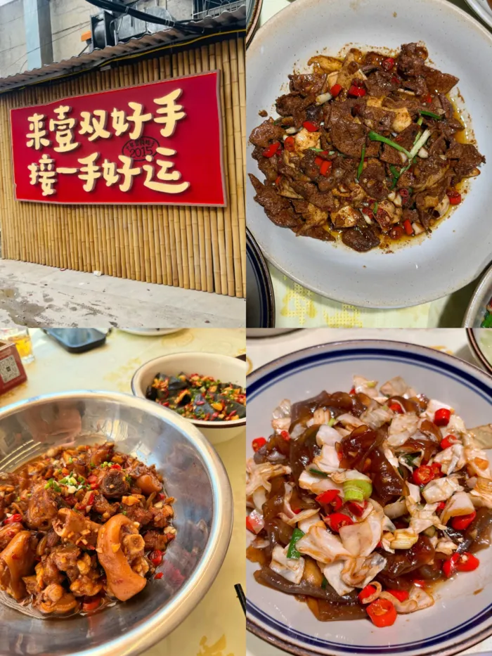 推荐理由: 这家藏在安置小区里的店,没有任何营销,全靠口碑在长沙老口子圈里口口相传。环境就是大排档风格,饭点去晚了只能坐外面。菜都在前台现点,招牌菜卖完就没有。招牌金碗牛肉是必点,牛肉口感介于干香和鲜嫩之间,炒得极入味,辣椒的“爆发力”十足,越辣越停不下来。酸萝卜牛肚是另一道下饭神器,酸萝卜的脆爽配上牛肚的弹牙,一勺菜能干掉三碗饭。