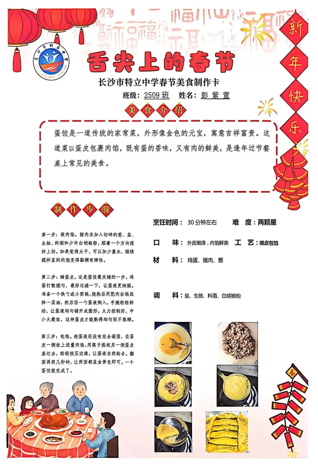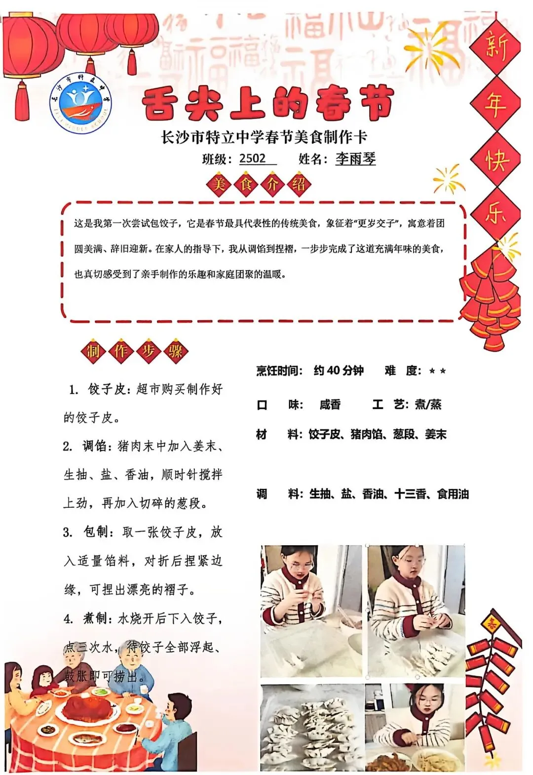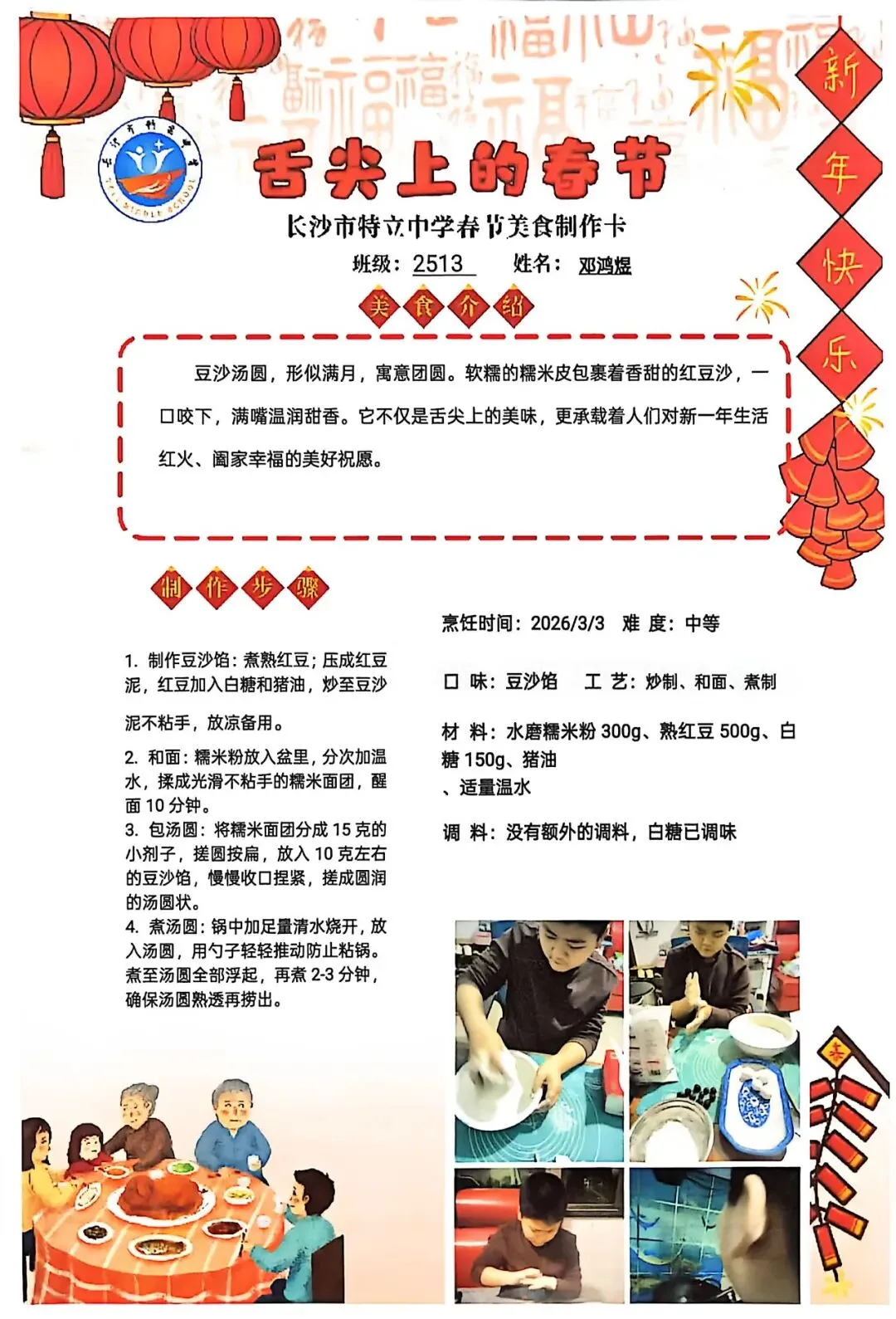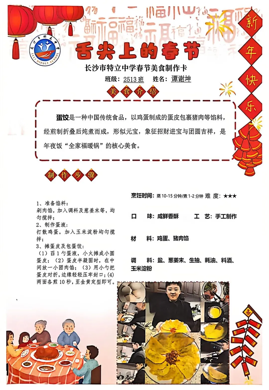 七年级同学与家人携手,巧手制作饺子、汤圆、蟹黄粉丝煲、蛋饺、肉丸子等特色年食,在烟火氤氲中沉浸式体验传统年俗。同学们认真填写一张张春节美食制作卡,细致记录食材配比、烹饪工艺与创作故事,镜头定格下亲子协作的温馨瞬间,文字诉说着年味里的浓浓亲情,尽显对中华传统饮食文化的深刻理解与传承。