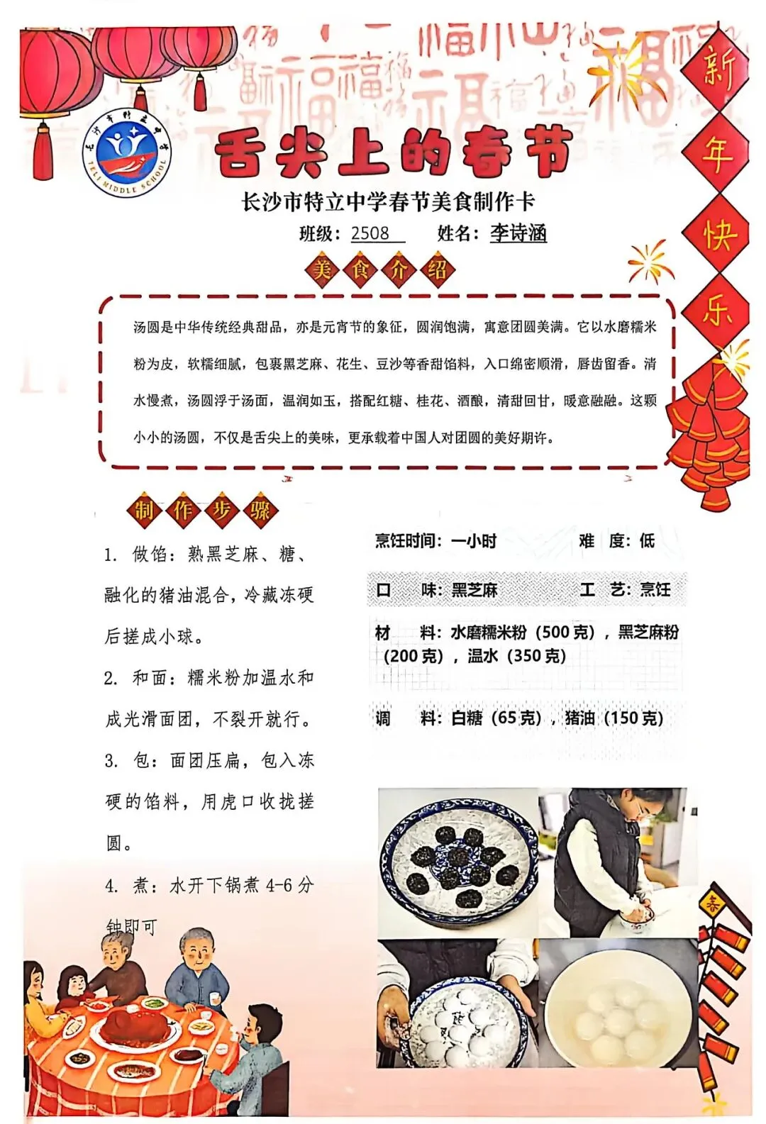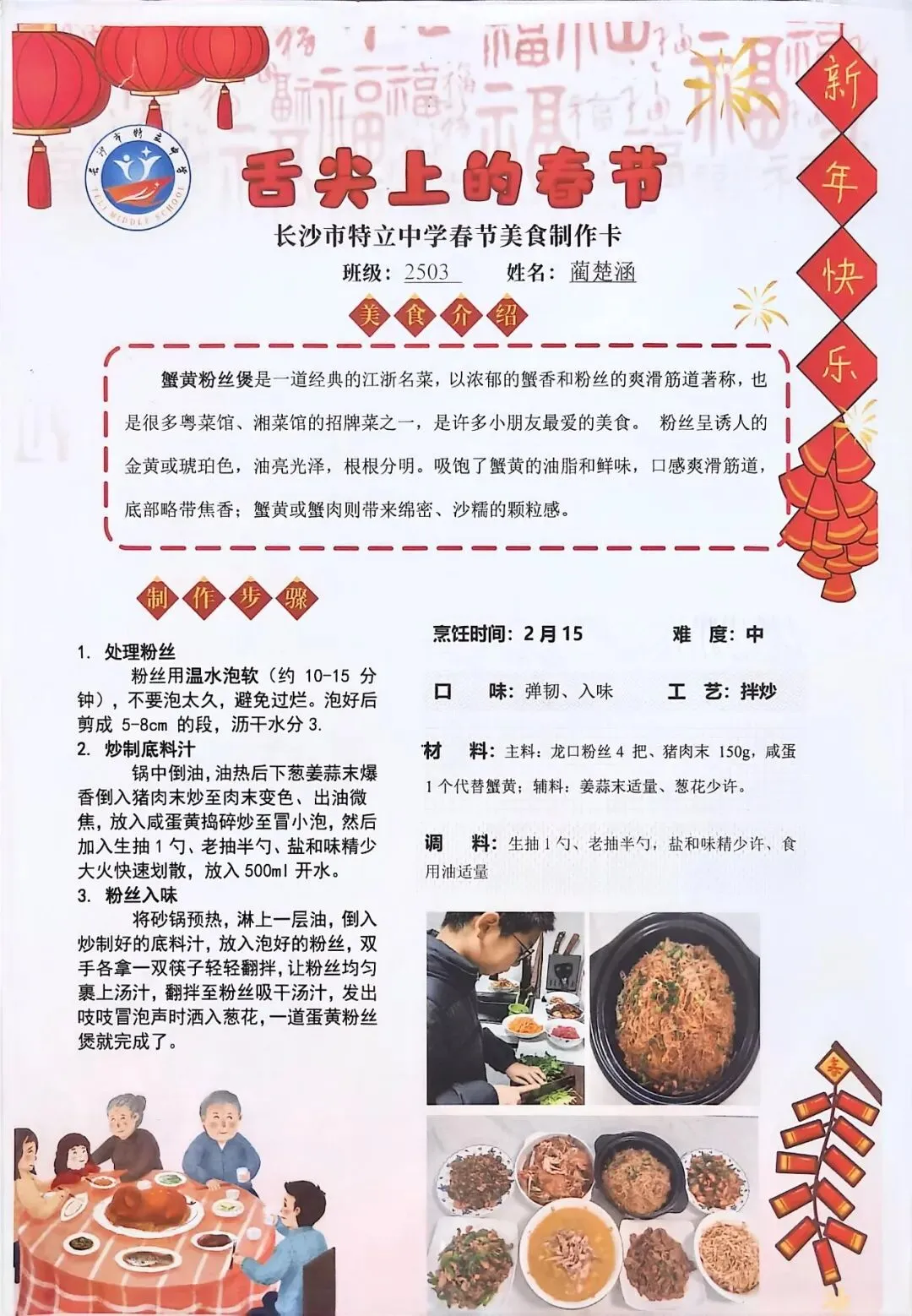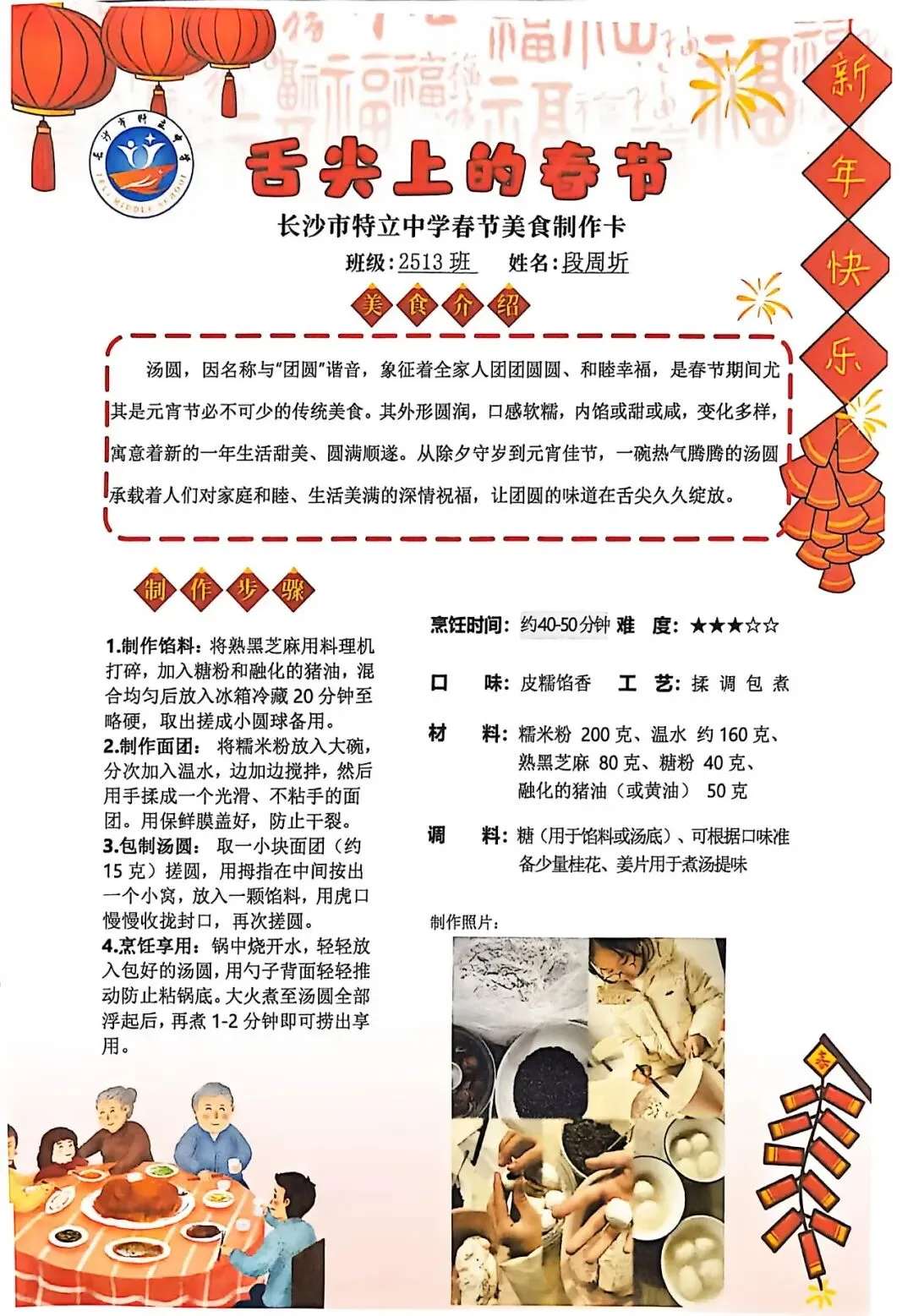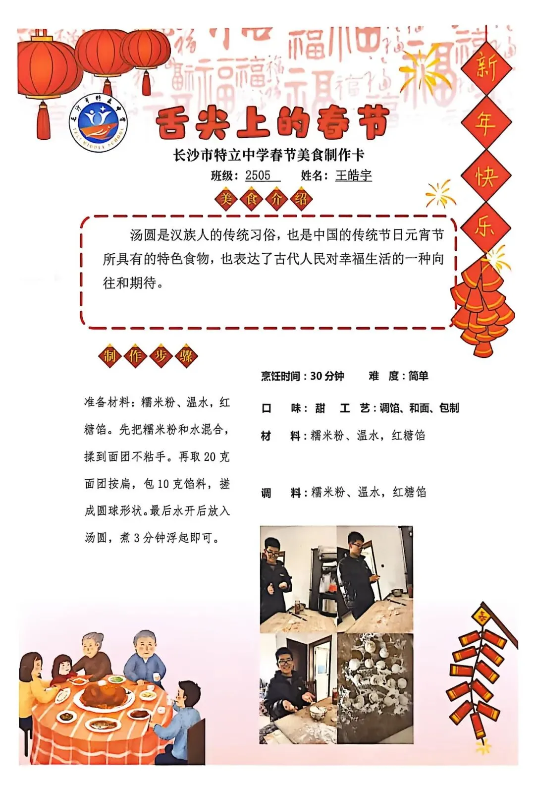 七年级同学与家人携手,巧手制作饺子、汤圆、蟹黄粉丝煲、蛋饺、肉丸子等特色年食,在烟火氤氲中沉浸式体验传统年俗。同学们认真填写一张张春节美食制作卡,细致记录食材配比、烹饪工艺与创作故事,镜头定格下亲子协作的温馨瞬间,文字诉说着年味里的浓浓亲情,尽显对中华传统饮食文化的深刻理解与传承。