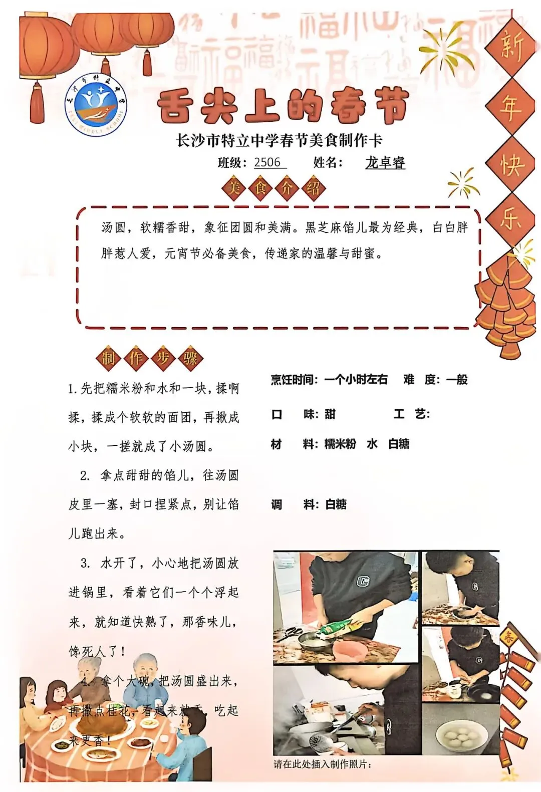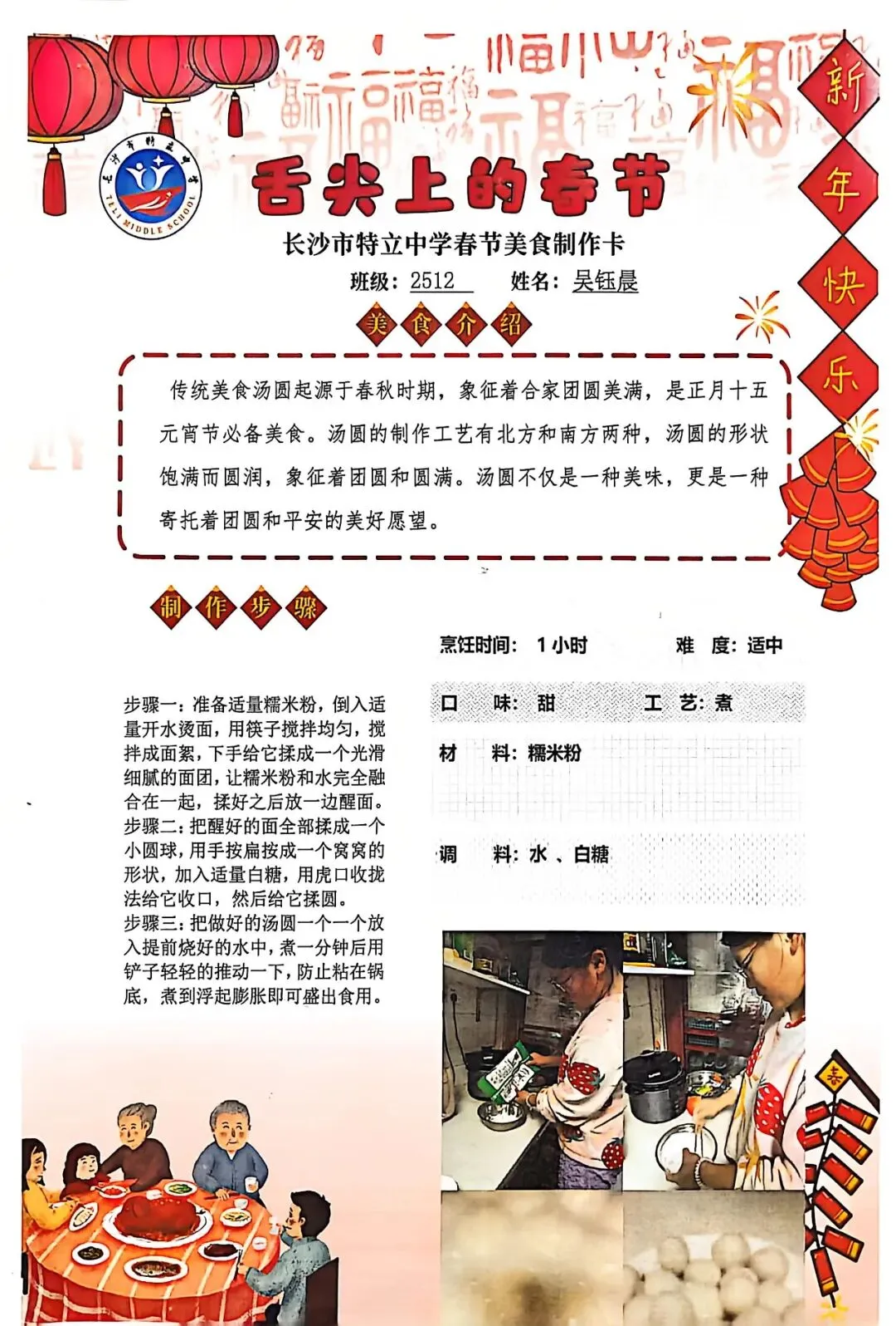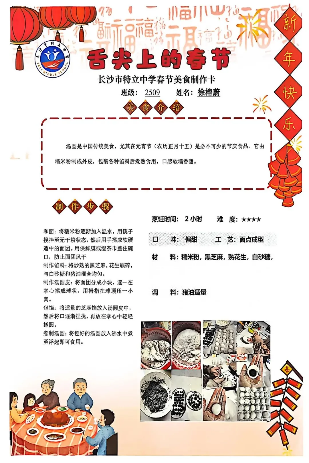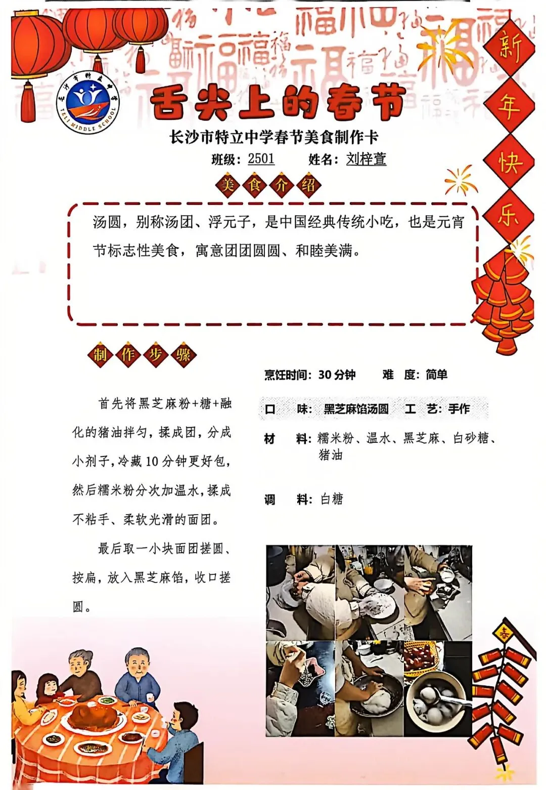 七年级同学与家人携手,巧手制作饺子、汤圆、蟹黄粉丝煲、蛋饺、肉丸子等特色年食,在烟火氤氲中沉浸式体验传统年俗。同学们认真填写一张张春节美食制作卡,细致记录食材配比、烹饪工艺与创作故事,镜头定格下亲子协作的温馨瞬间,文字诉说着年味里的浓浓亲情,尽显对中华传统饮食文化的深刻理解与传承。