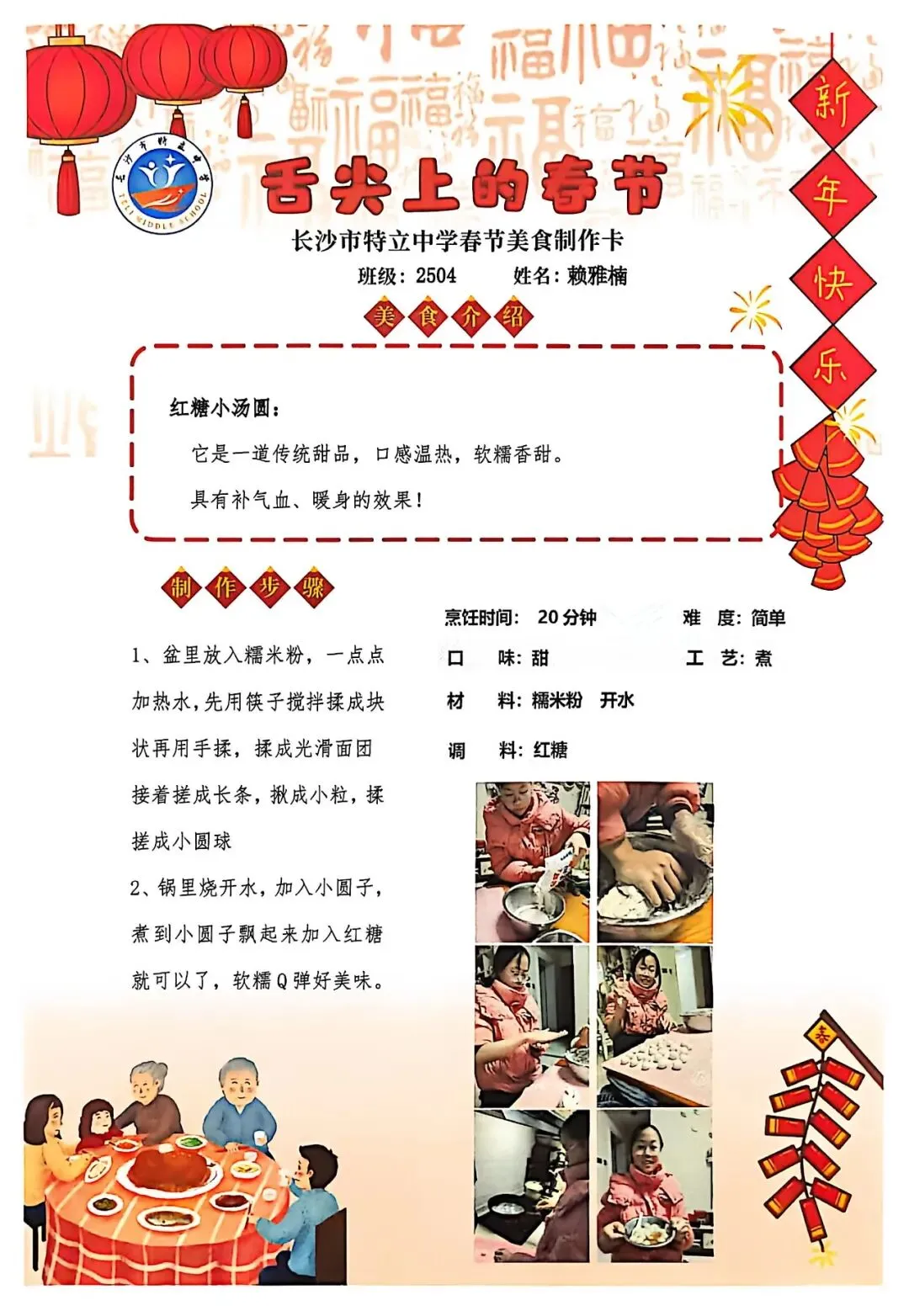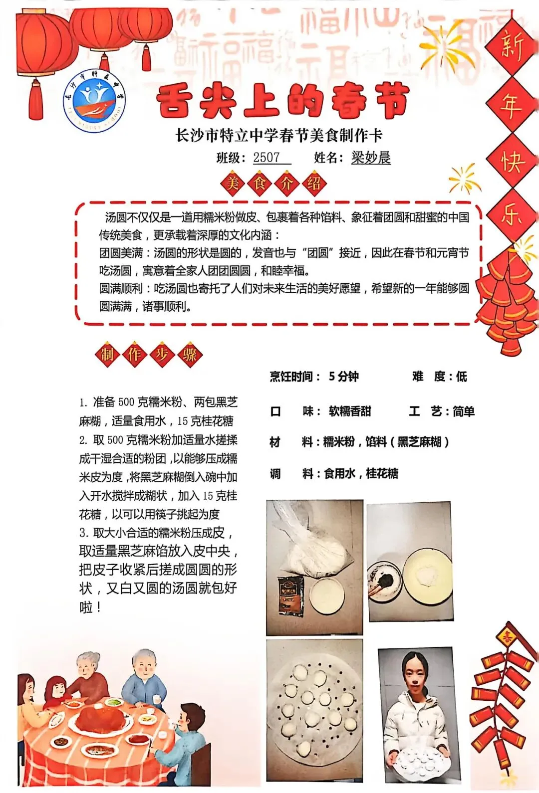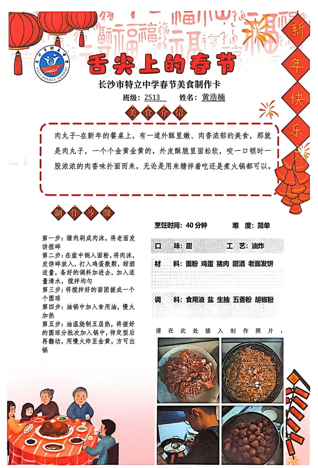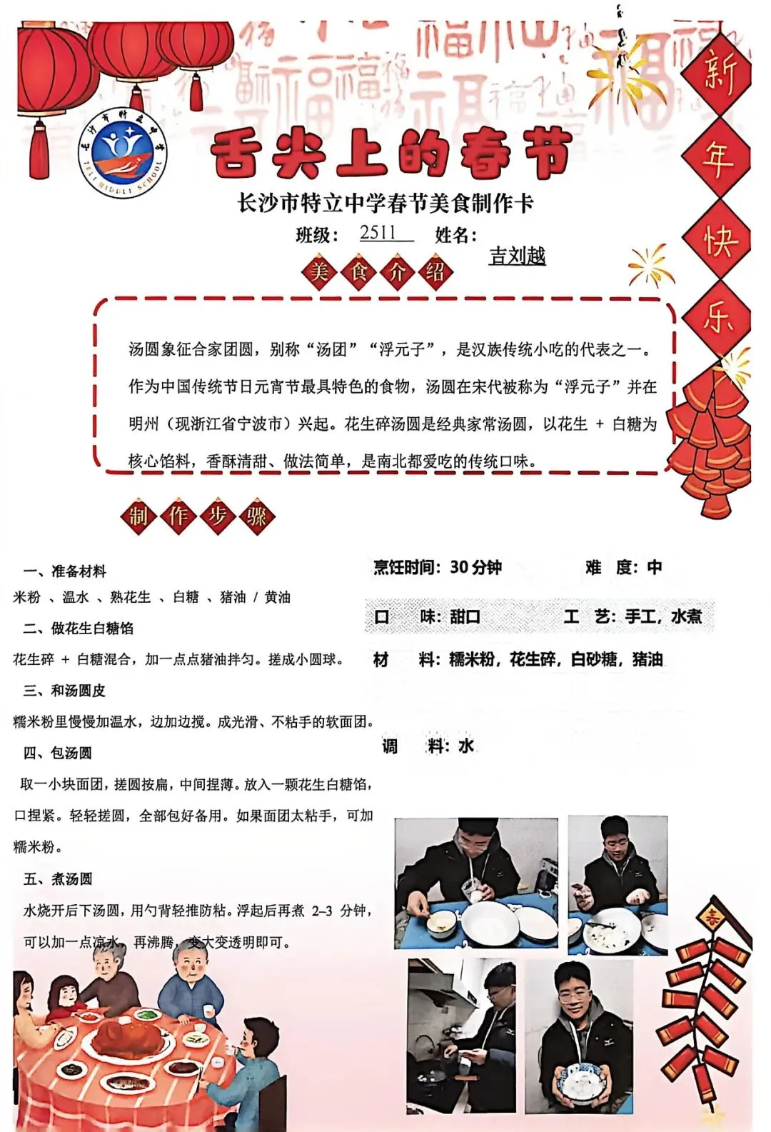 七年级同学与家人携手,巧手制作饺子、汤圆、蟹黄粉丝煲、蛋饺、肉丸子等特色年食,在烟火氤氲中沉浸式体验传统年俗。同学们认真填写一张张春节美食制作卡,细致记录食材配比、烹饪工艺与创作故事,镜头定格下亲子协作的温馨瞬间,文字诉说着年味里的浓浓亲情,尽显对中华传统饮食文化的深刻理解与传承。