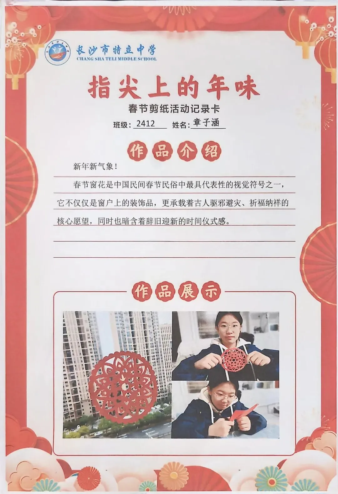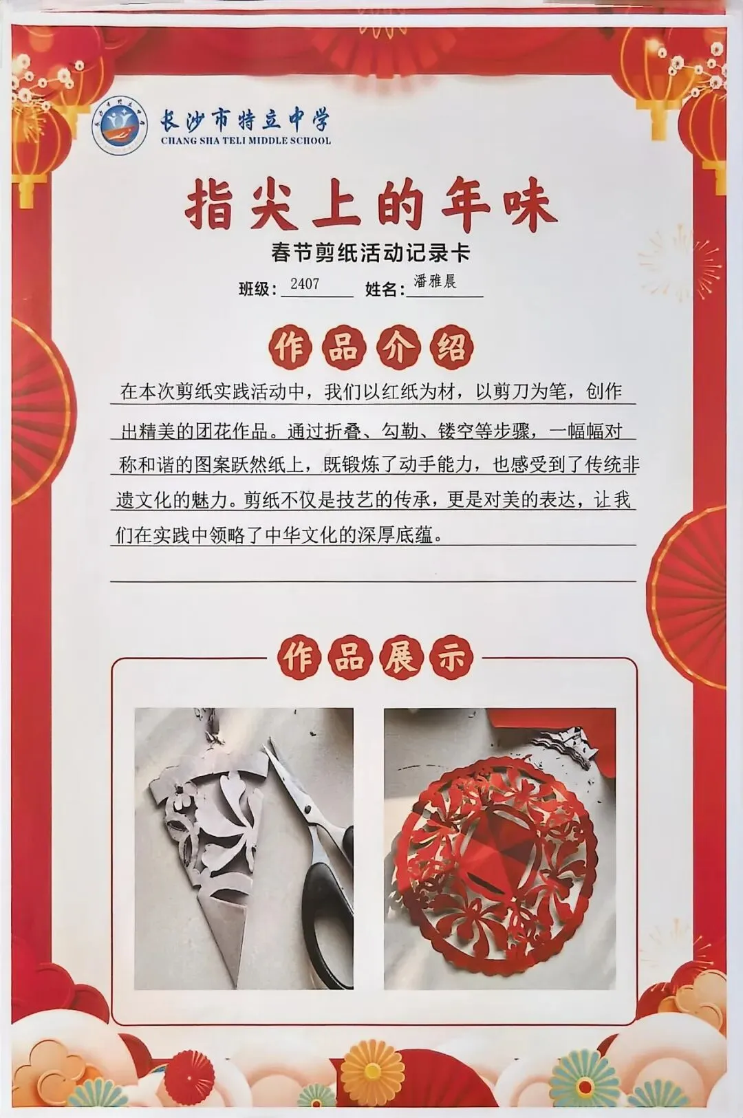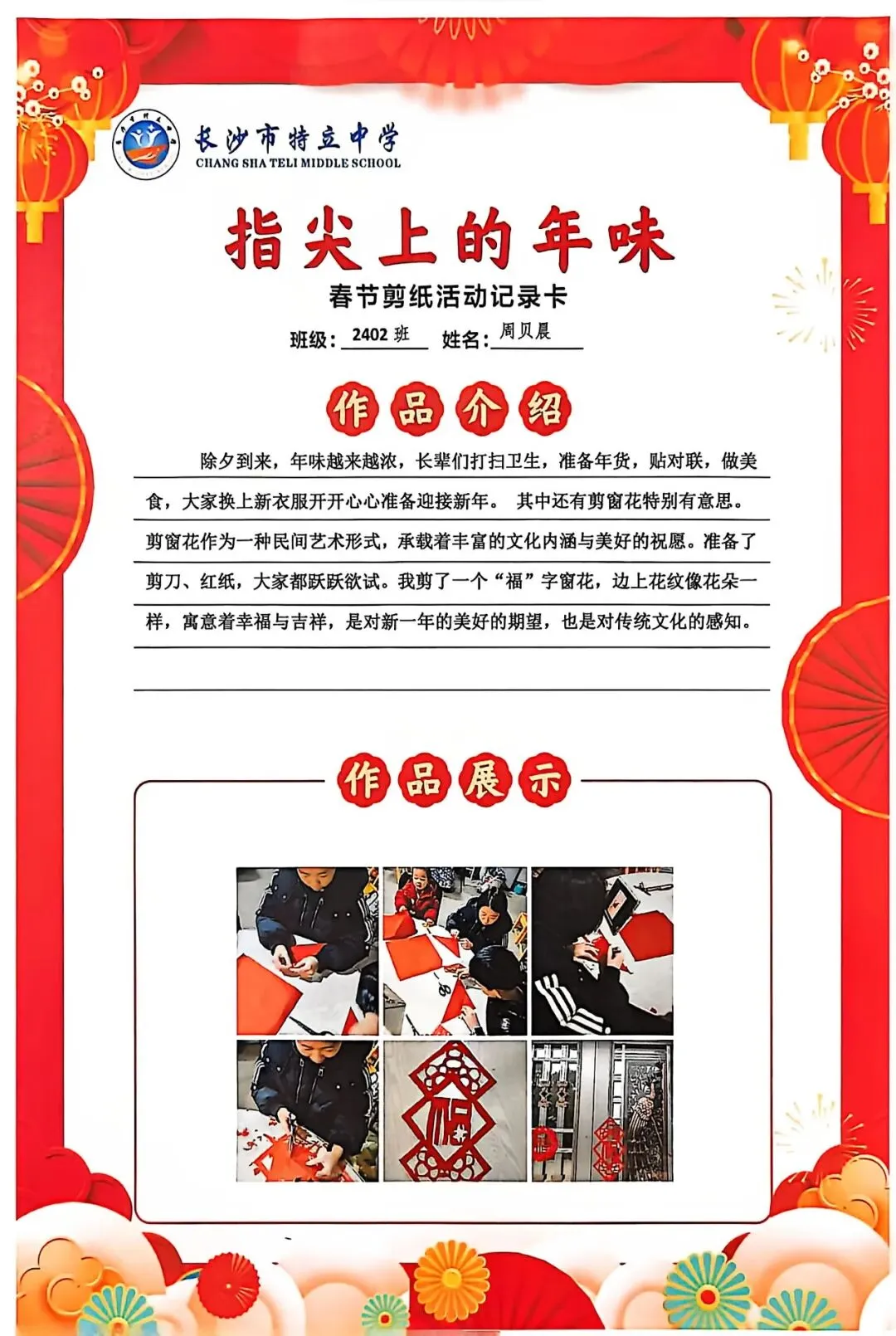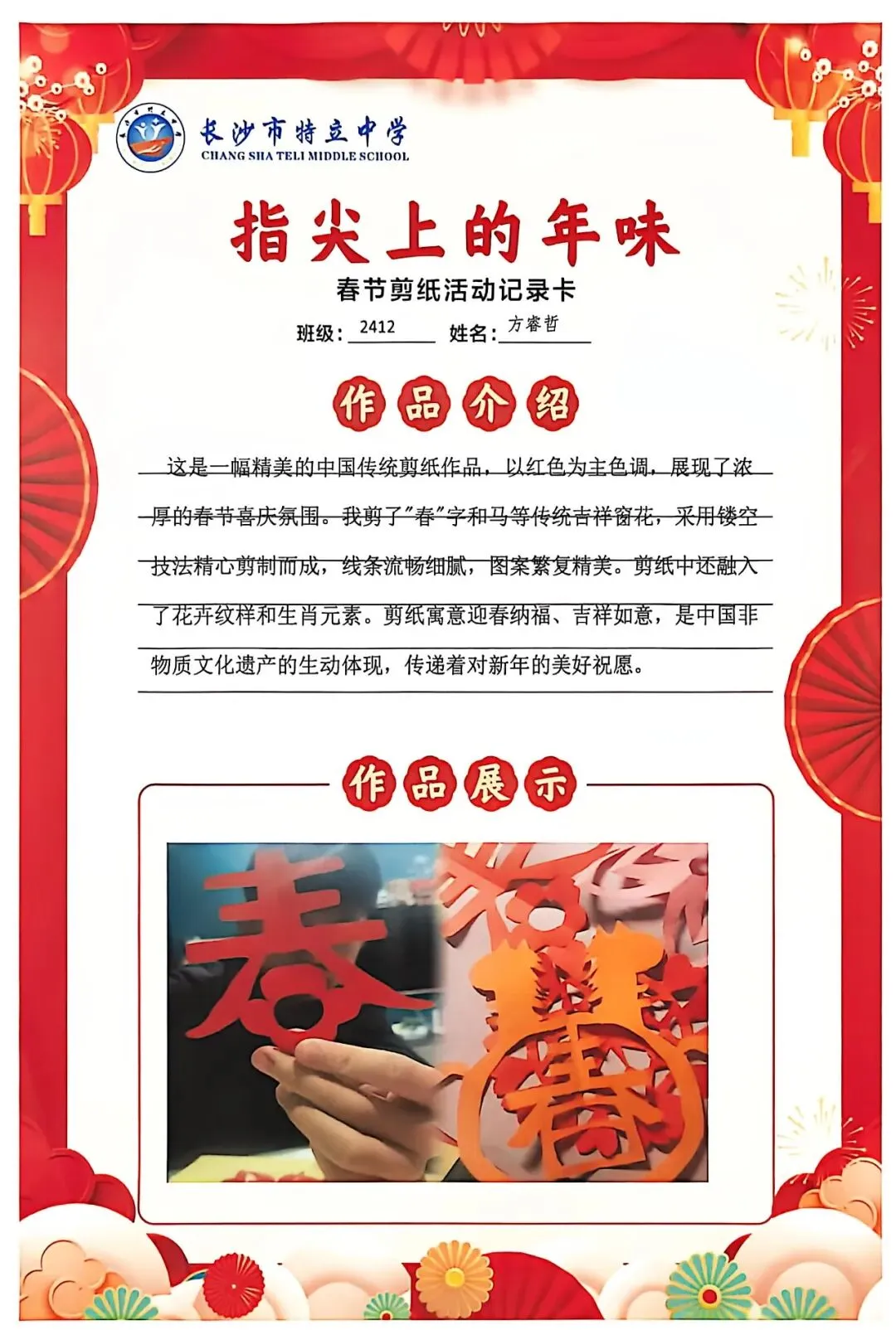一张张春节剪纸活动记录卡上,作品介绍凝练着同学们对非遗文化的理解,精美照片定格着匠心巧思,从折叠、勾勒到镂空、裁剪,每一个步骤都饱含着对传统的敬意。