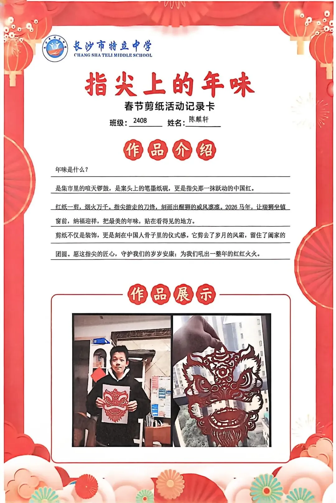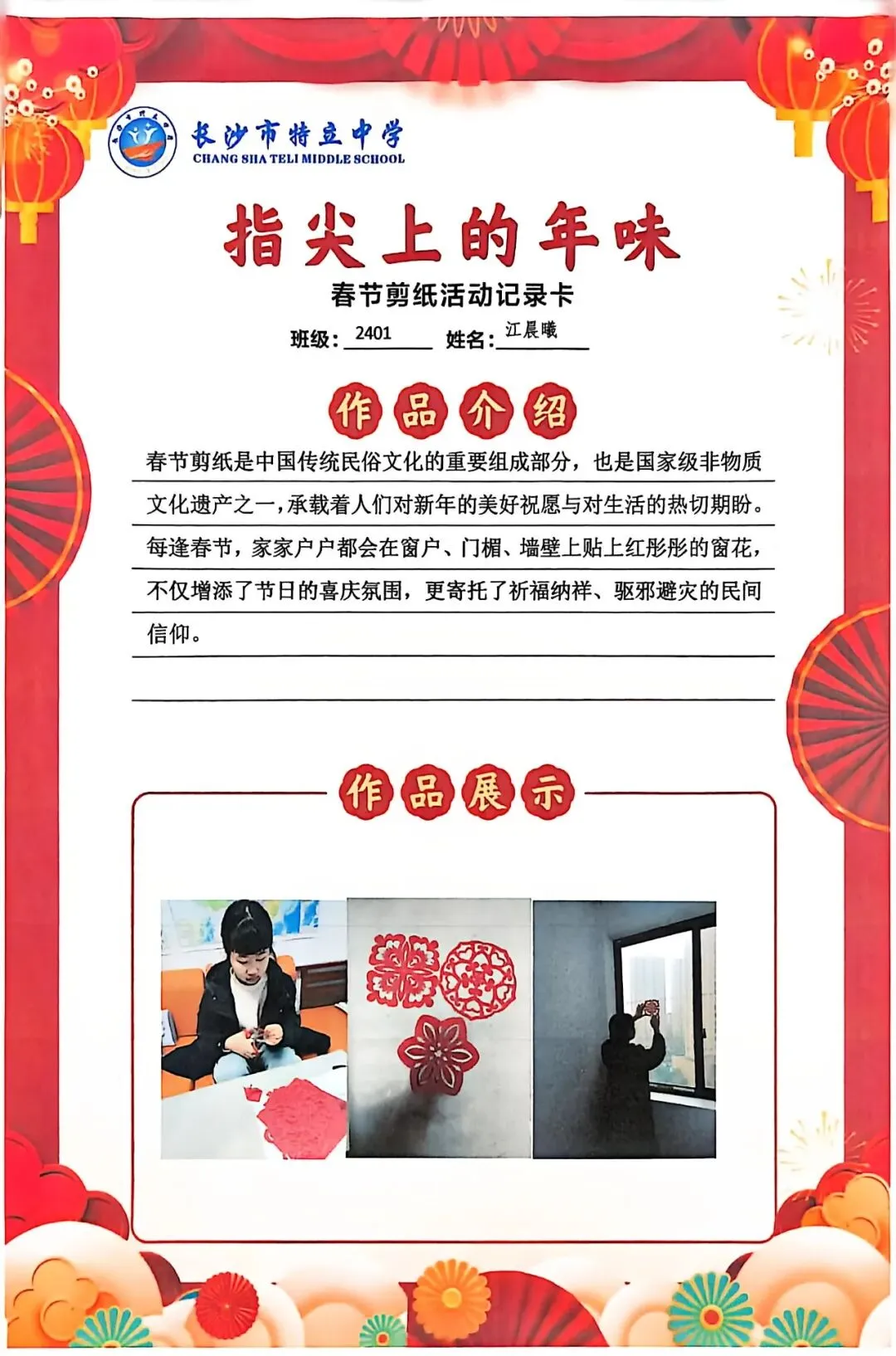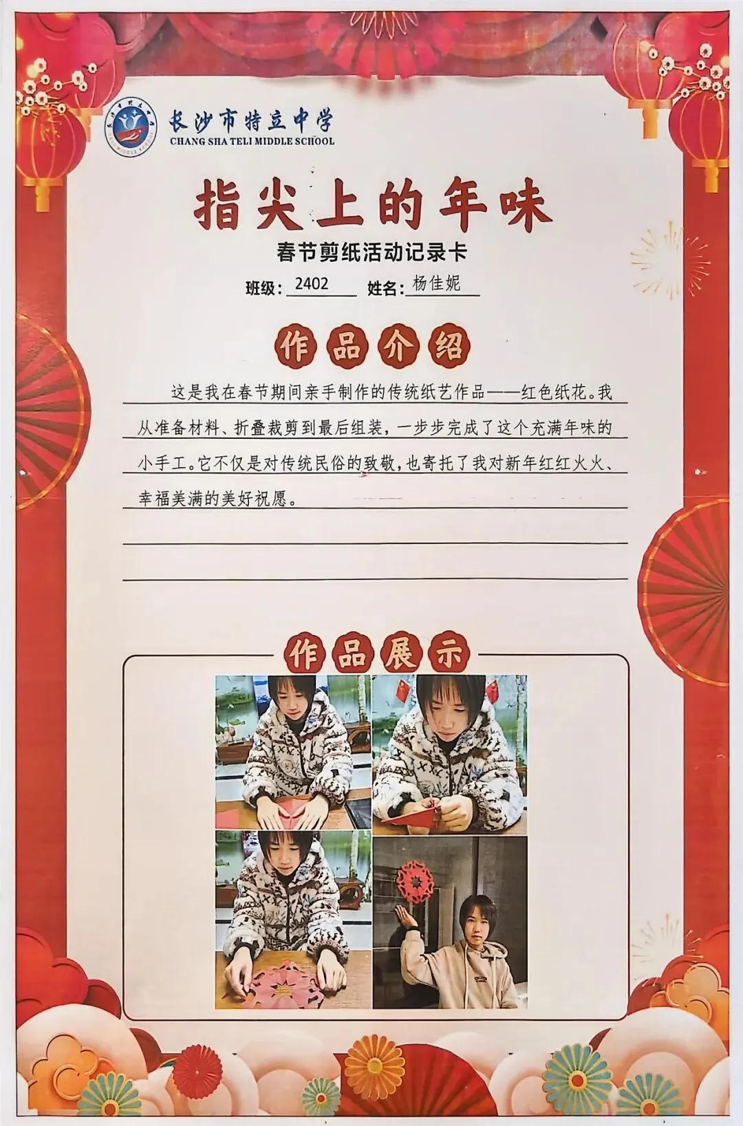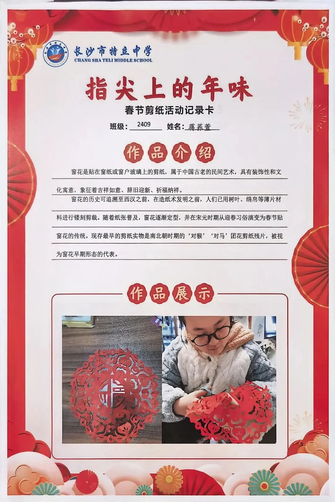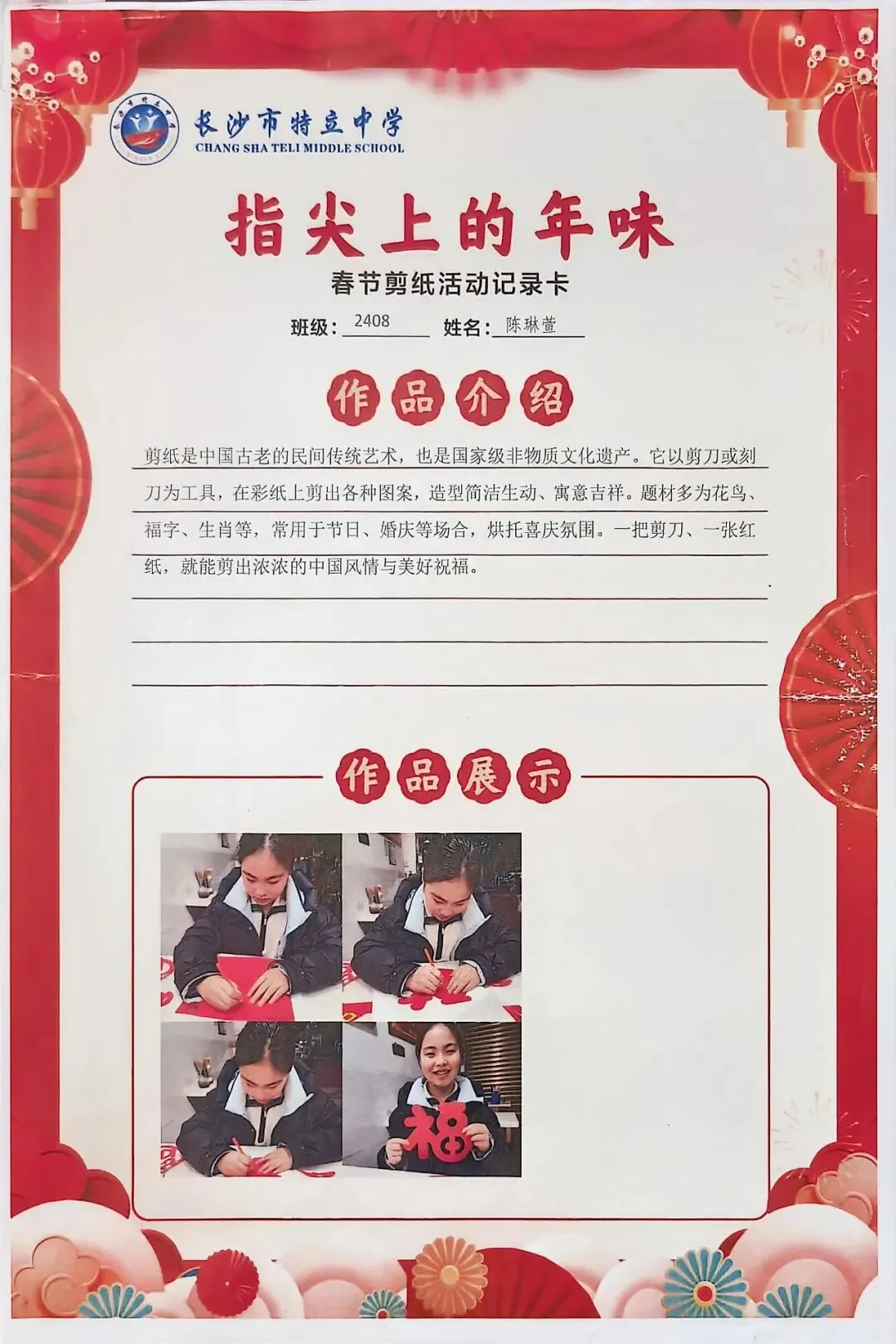 一张张春节剪纸活动记录卡上,作品介绍凝练着同学们对非遗文化的理解,精美照片定格着匠心巧思,从折叠、勾勒到镂空、裁剪,每一个步骤都饱含着对传统的敬意。