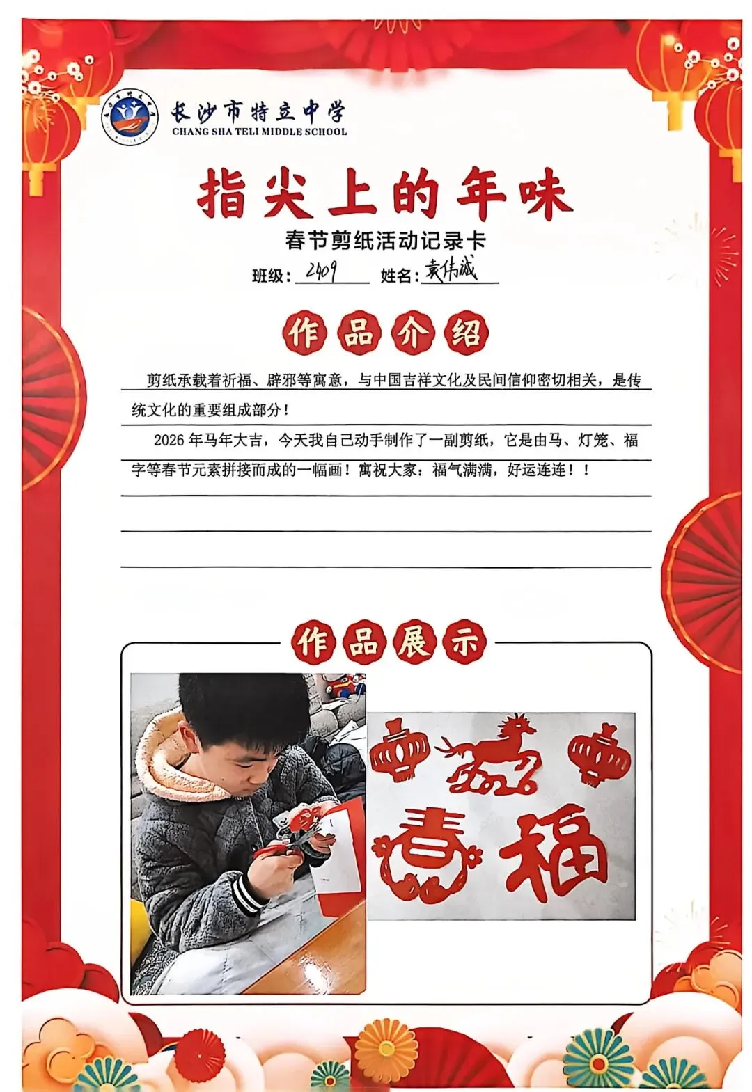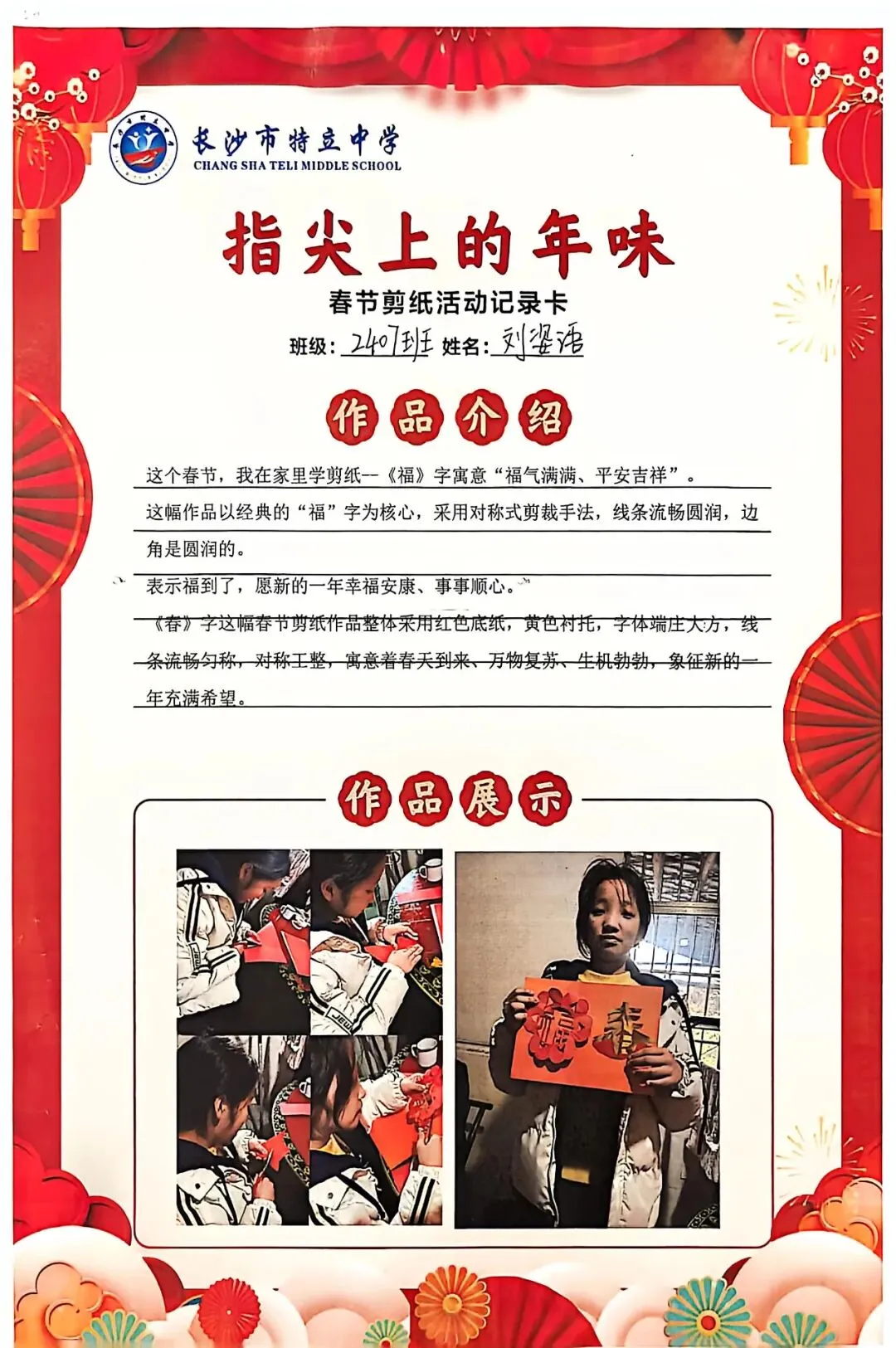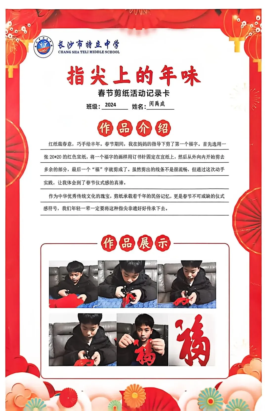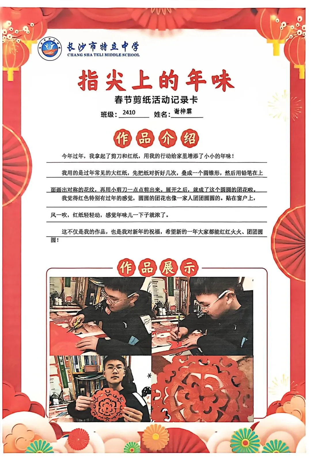 一张张春节剪纸活动记录卡上,作品介绍凝练着同学们对非遗文化的理解,精美照片定格着匠心巧思,从折叠、勾勒到镂空、裁剪,每一个步骤都饱含着对传统的敬意。