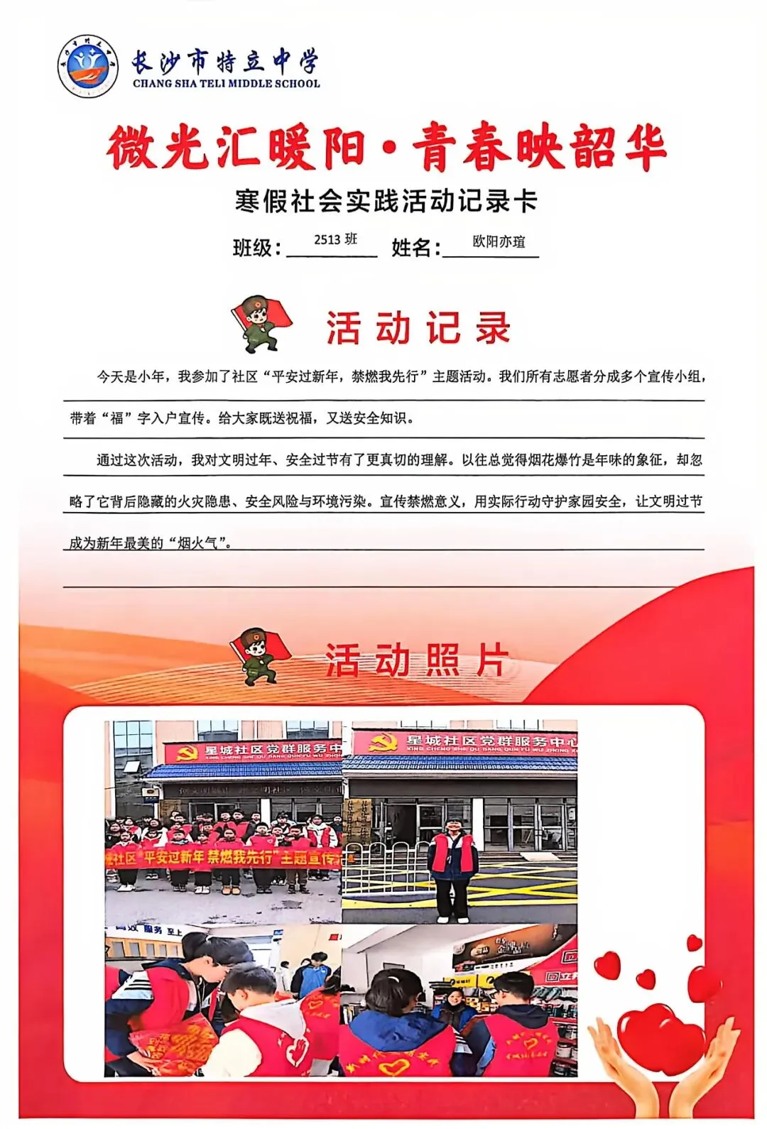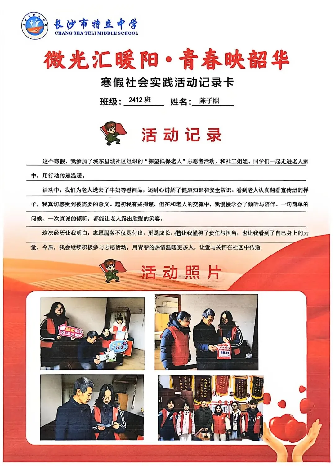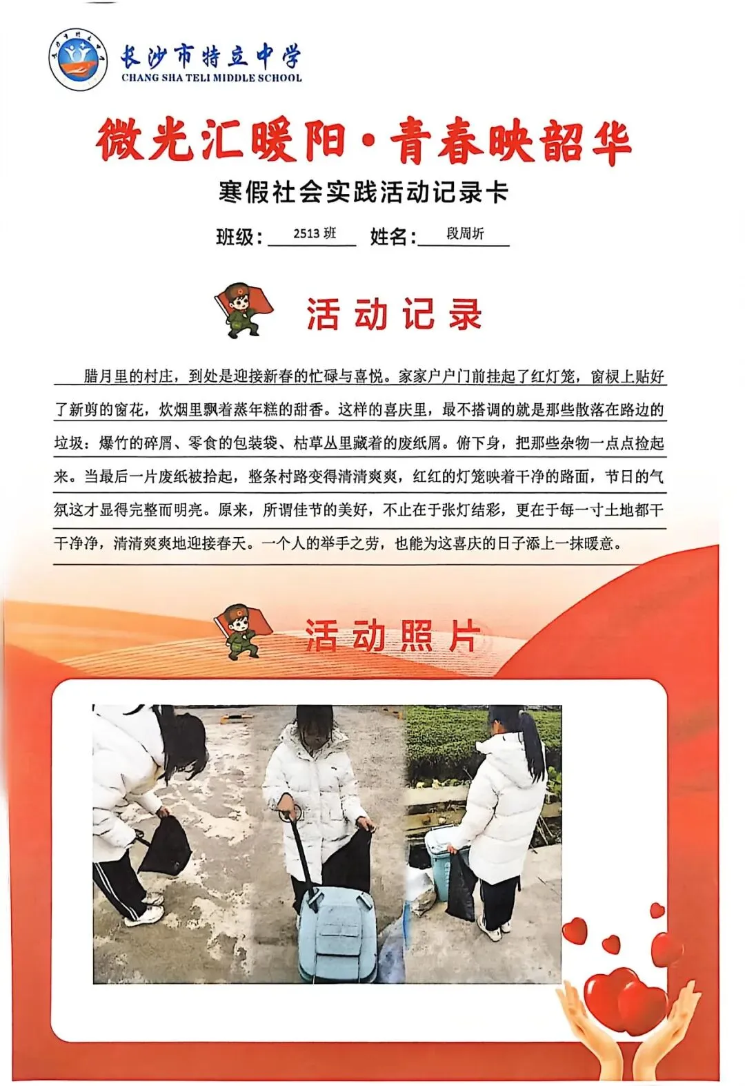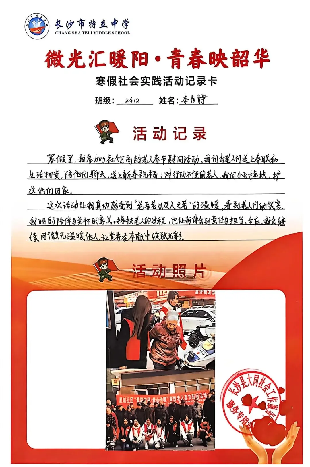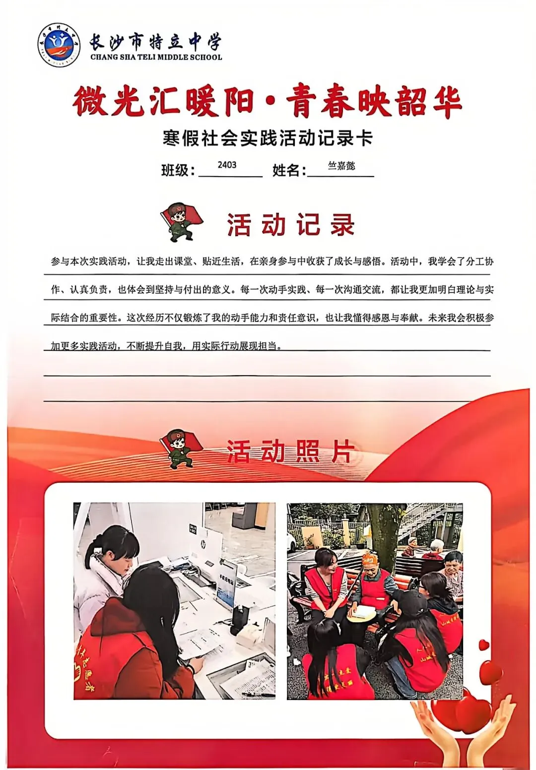 一张张社会实践活动记录卡,定格下少年们无私奉献的瞬间,一段段真挚感悟诉说着成长与收获。同学们在志愿服务中,体会到帮助他人的快乐,学会了耐心沟通与真诚付出,更懂得了责任与担当,用点点微光汇聚成冬日暖阳,践行着雷锋精神,让青春在奉献中绽放光彩。